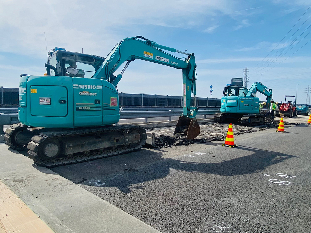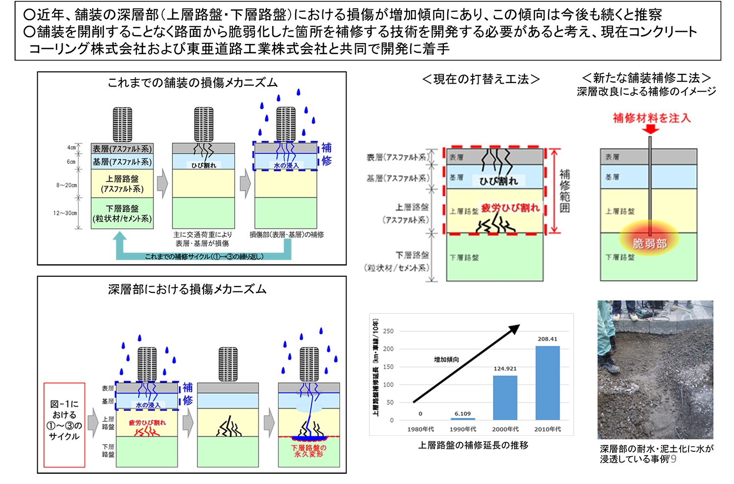 もう1つは新たな舗装補修工法開発の取組みです。舗装深層部の損傷が増加傾向にあることから、舗装を開削することなく補修材料を路面から脆弱箇所に注入する技術の開発に着手しました。コンクリートコーリング㈱および東亜道路工業㈱と共同で開発を進めています。