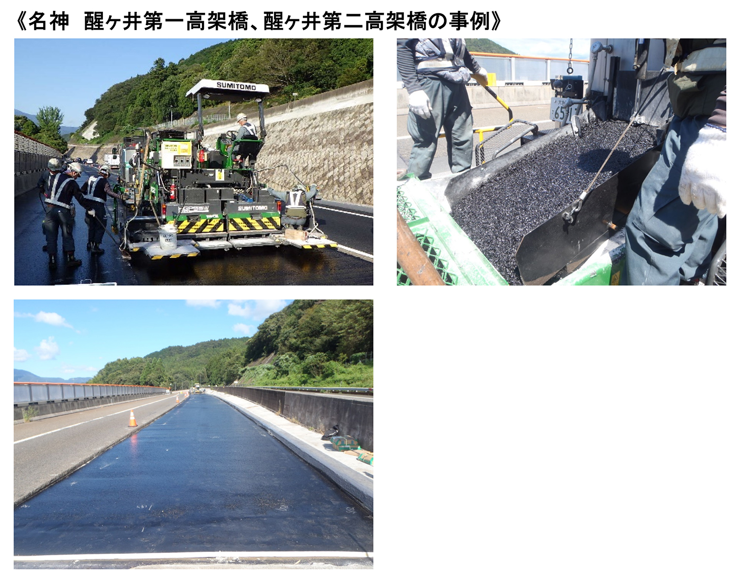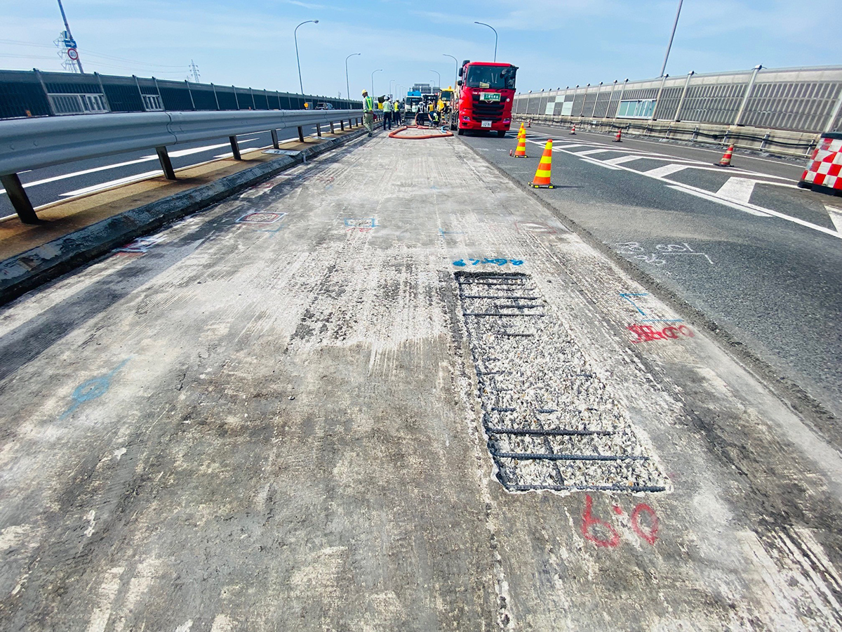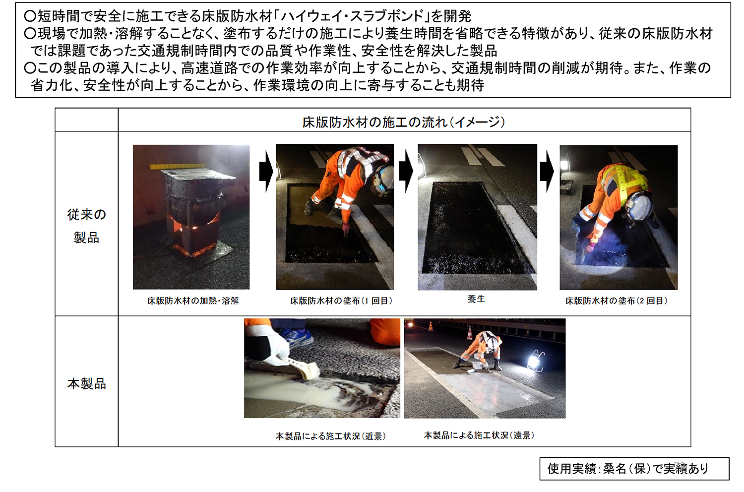 補修技術としては、中日本ハイウェイ・メンテナンス名古屋㈱が開発した「ハイウェイ・スラブボンド」があります。現場で加熱・溶融することなく、塗布するだけの施工により養生期間を省略できる短時間で安全に施工できる床版防水材です。小面積の補修に適用しています。GⅡの性能はなく、あくまでGⅠ相当と考えています。