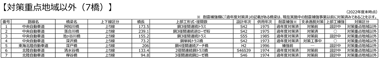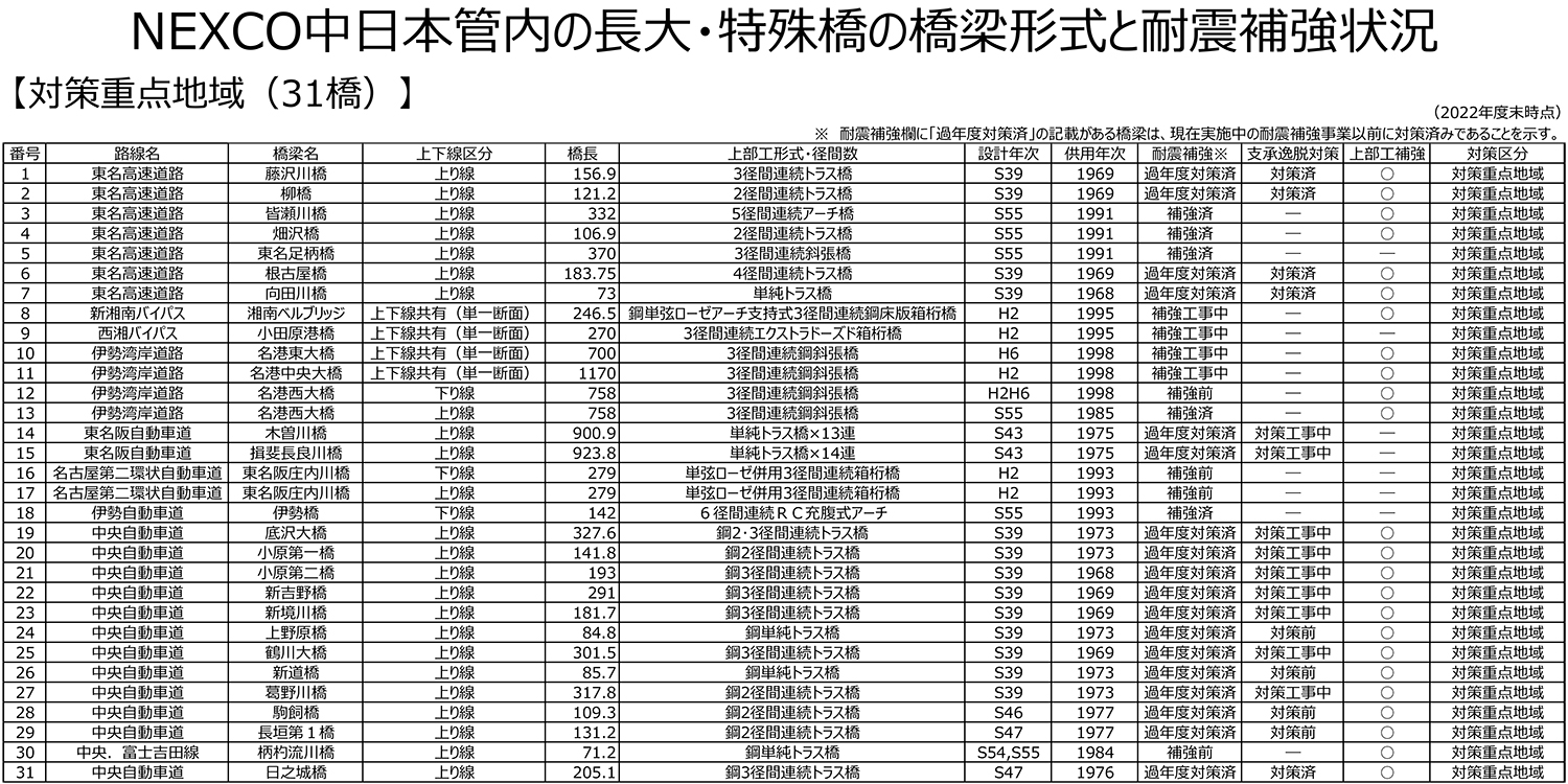 中井 長大・特殊橋梁は対策重点地域に31橋、それ以外の地域に7橋あります。31橋については、工事発注が約7割完了しています(工事完了含む)。下の表の「耐震補強」の列が【過年度対策済】と記載されており、「支承逸脱対策」の列が【対策前】と記載されている橋梁は、支承逸脱対策のみがまだできていない状態を示します。