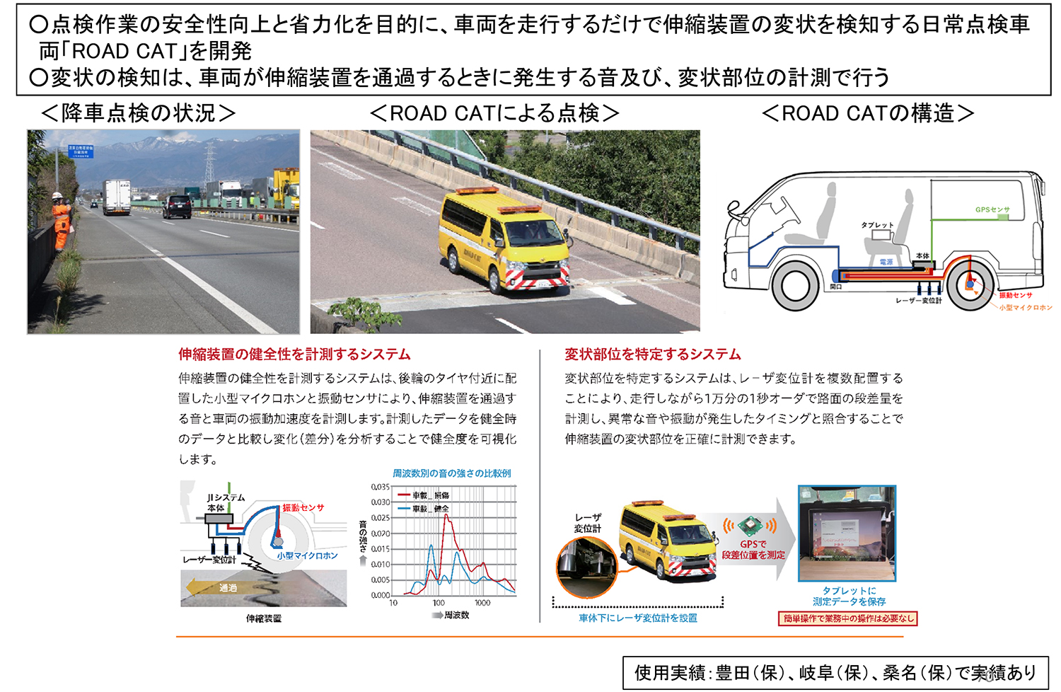 また、中日本ハイウェイ・エンジニアリング東京㈱が開発した「ROAD CAT」は、車両を走行させるだけで伸縮装置の変状を検知する日常点検車です。「ROAD CAT」は変状があるか否かを調べるスクリーニングで使用し、「ROAD CAT」で変状を検知したものについて降車点検を行っています。降車して音を聞く作業は危険がともなうため、点検作業の安全性向上と省力化を目的に使用しているものです。