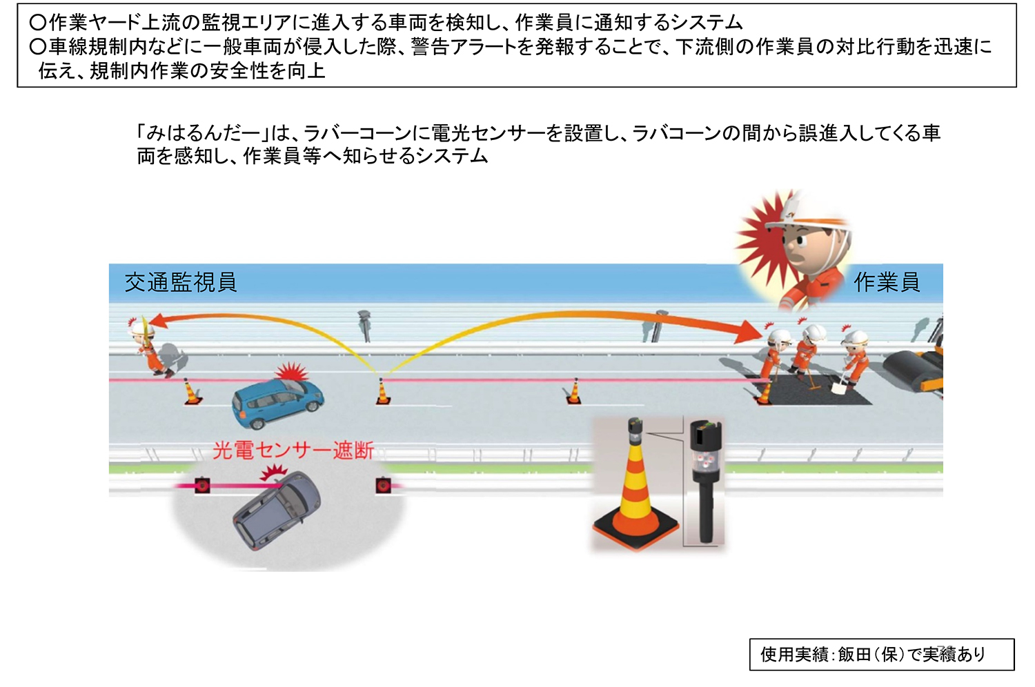 中日本ハイウェイ・メンテナンス名古屋㈱が開発した「みはるんだー」は作業エリア上流の監視エリアに進入する車両を検知し、作業員に通知するシステムです。