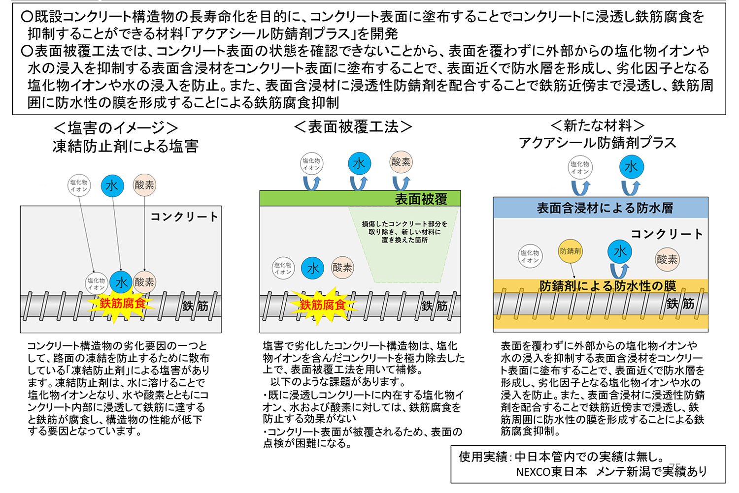 また、中日本ハイウェイ・エンジニアリング東京㈱が開発したアクアシール防錆剤プラスは既設コンクリート構造物の延命化を目的にシラン系表面含浸材に浸透性防錆材を追加配合した製品で、試験的に採用を行っています。