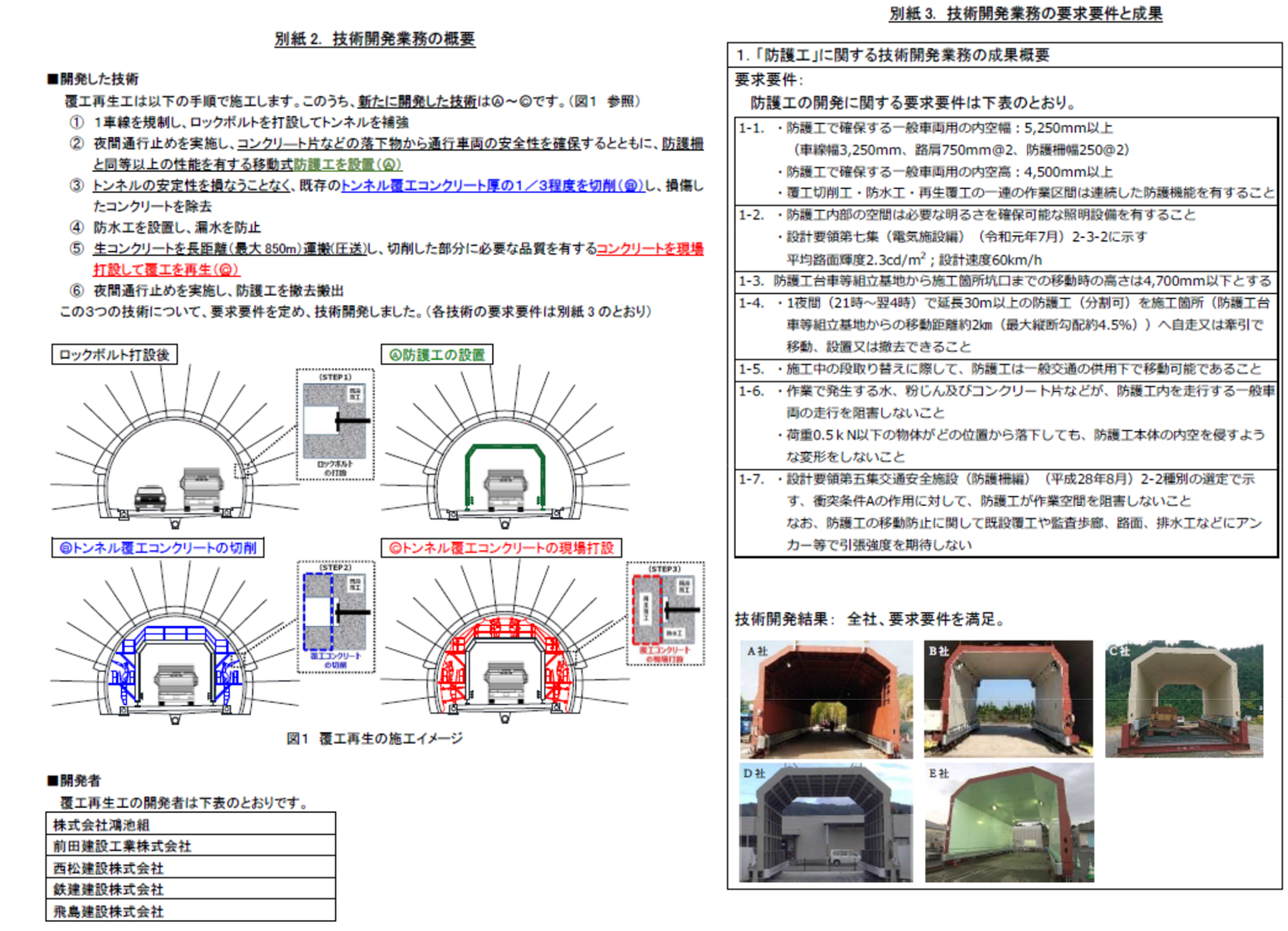 中井 矢板工法で建設されたトンネルで経年劣化による覆工コンクリートのひび割れや背面空洞など老朽化が進んでいるため、トンネル覆工の更新工事を行う必要があります。既設覆工をロックボルトで補強した上で、覆工厚の一部を切削し、防水シートを設置し、切削した分を新たに二次覆工的に打設するほぼNATM化するような再生工法です。施工中の長期通行止めを回避するための覆工用の防護工や施工設備導入など、車線規制による施工方法の技術開発とその実証を2021年4月~2022年10月まで実施しました。その結果、契約した5社いずれの工法も採用可能であることが確認できたことから2023年3月に技術開発が完了したことを発表しています。