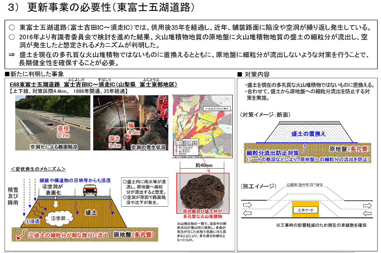 中井 東富士五湖道路のような事例は当社のみです。多孔質の火山堆積物地質で形成された地盤の上に過去に火山堆積物地質で盛土を行っており、道路公団時代から陥没や空洞が確認されています。約2年前にも空洞が確認されていて、現在も四半期に1回の頻度でレーダー探査を行って、異常がないかを確認しています。異常があれば緊急通行止めを行ったうえで開削して対策を行っています。細粒分が流出していると想定されているため、盛土の置き換えを本格的にやらなければならないと考えています。