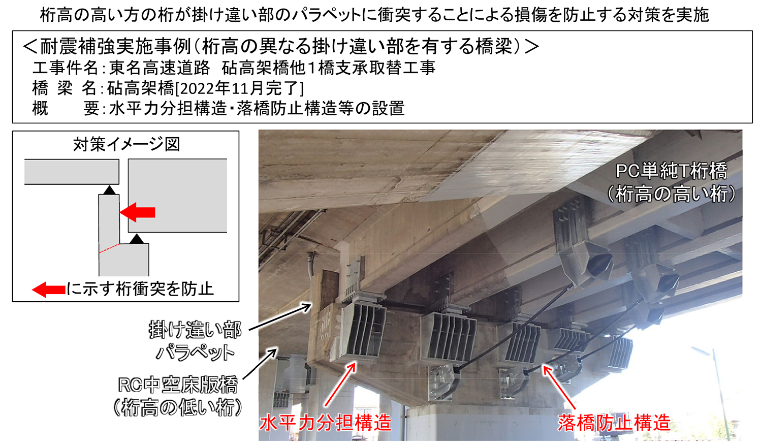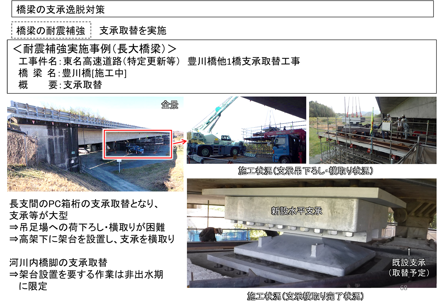 支承逸脱対策についても上下線のいずれかを優先して支承の補強や交換等を行っています。対策重点地域の176橋については発注が概成しており、それ以外の地域の69橋は設計を進めています。