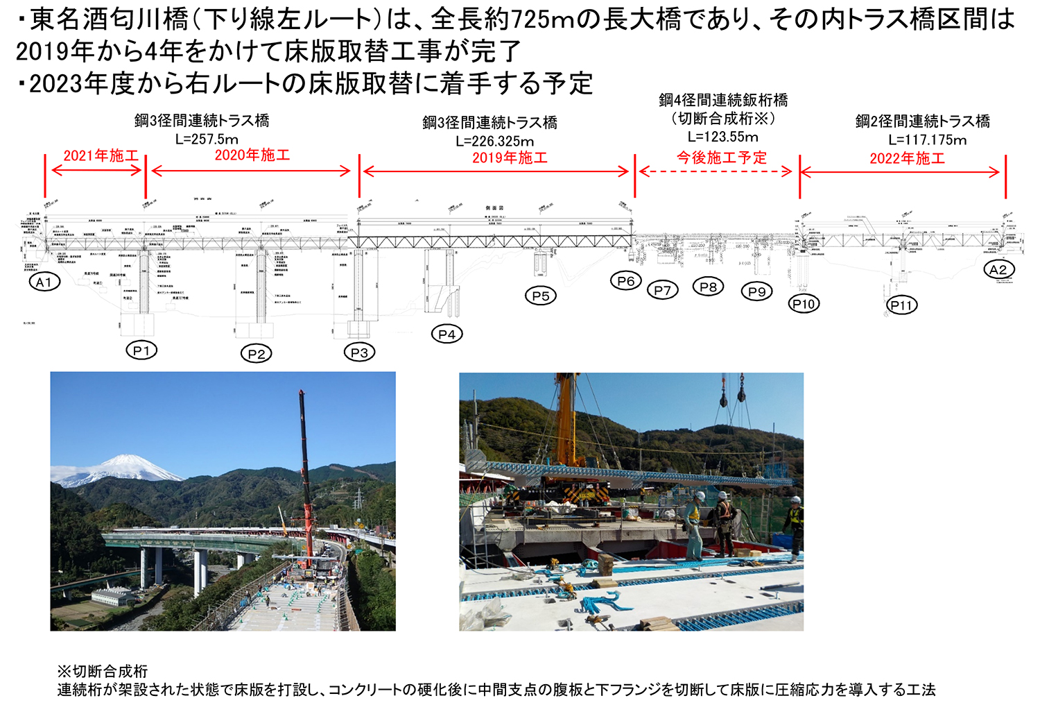 東名酒匂川橋(下り線の左ルート)は橋長約725mの長大橋で、曲線も入っています。そのうちP6~P10を除くトラス橋区間は2019年度から床版取替工事に着手し、4年かけて完了しました。また、今年から下り線の右ルートの施工に着手します。