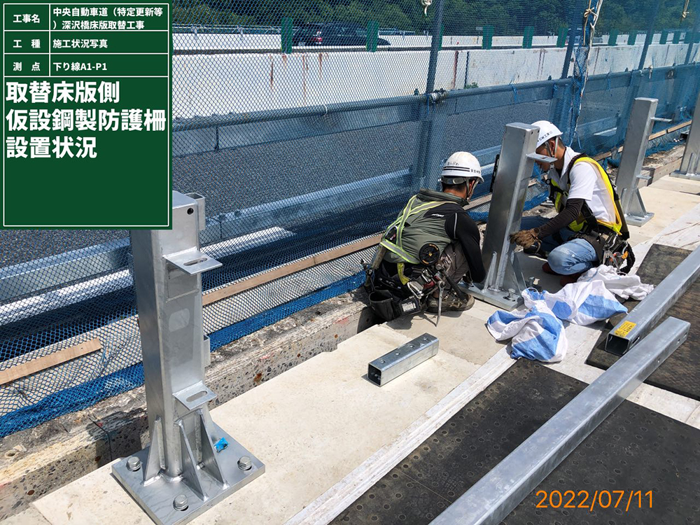 末吉 深沢橋については、半断面施工にて床版取替を実施しており、床版取替をしている車線と供用車線の間にコンクリート製のフロリダ製壁高欄を設置できるスペースがない状況です。そこで、1期(先行)施工の時は、既設床版に貫通用アンカー等を設けベースプレートタイプの仮設鋼製防護柵(SB種)※(支柱の幅150mm、ボックスビームの幅150mmの計300mm)を設置することで、半断面施工に必要な幅員を確保しています。2期施工時は、1期施工の新設のプレキャスト床版の内部にアンカープレートを埋込むなど、ベースプレートタイプの防護柵を固定できるような細工を予めしておき、鋼製防護柵を設置することで1期施工同様、必要な幅員を確保しています。