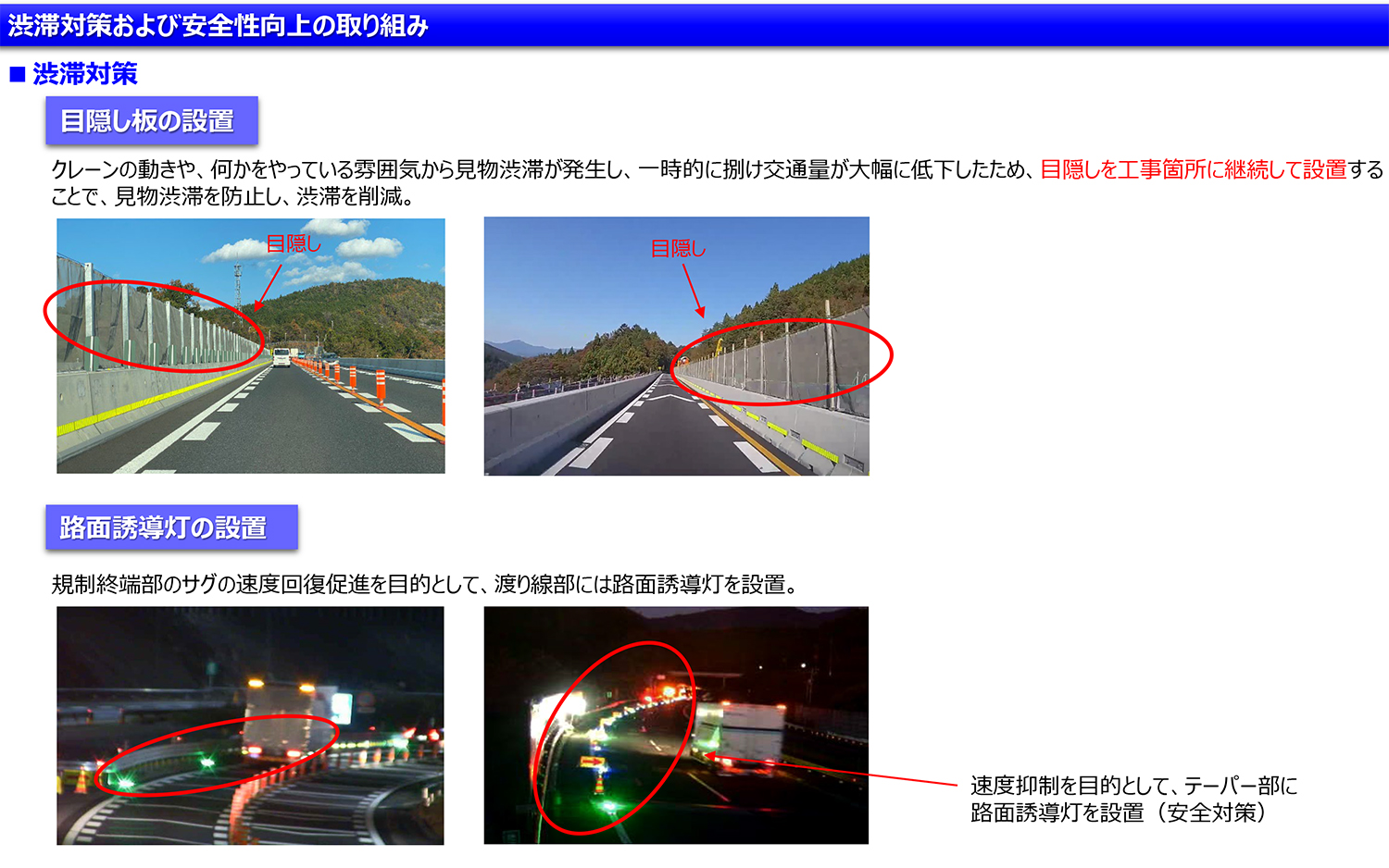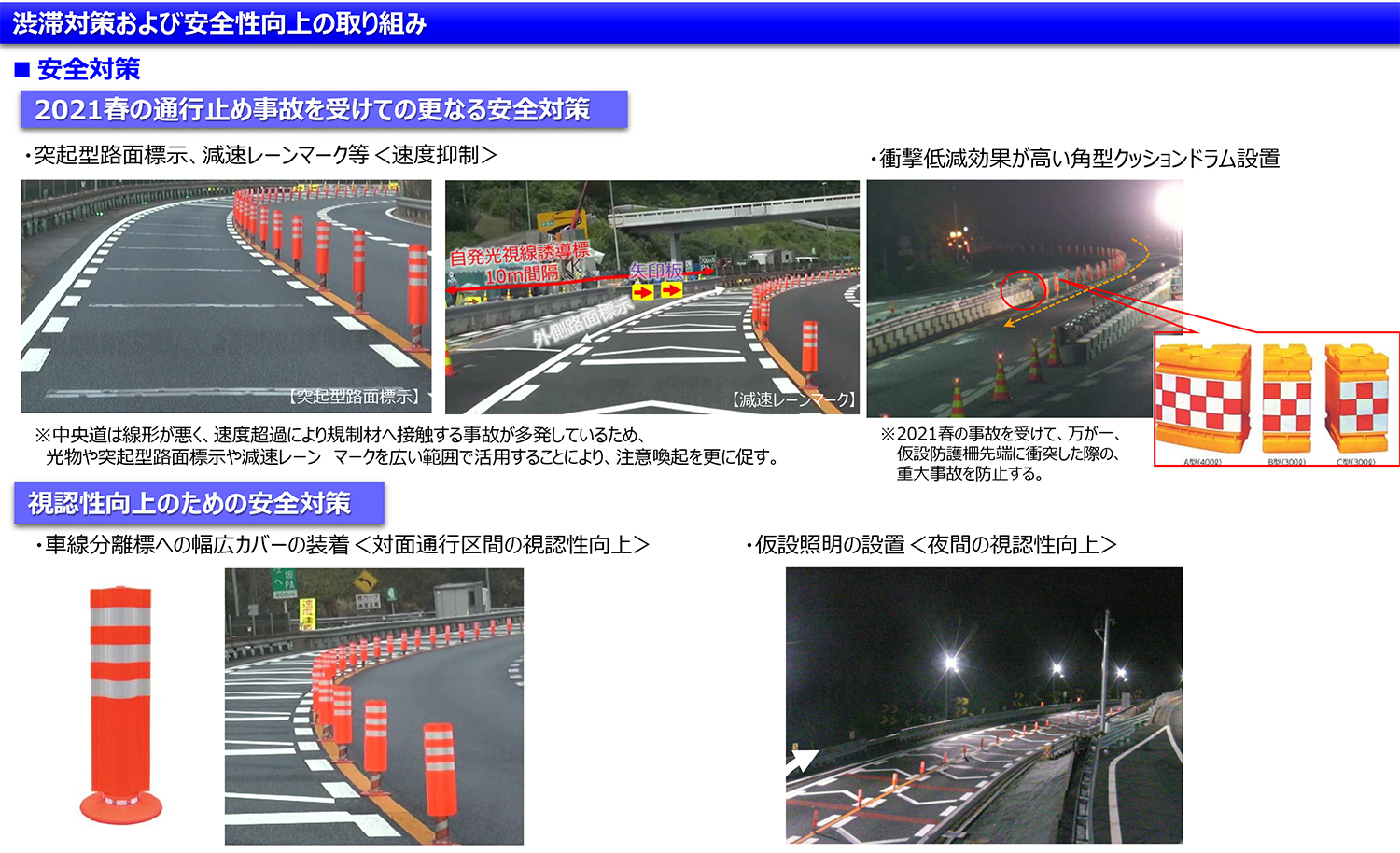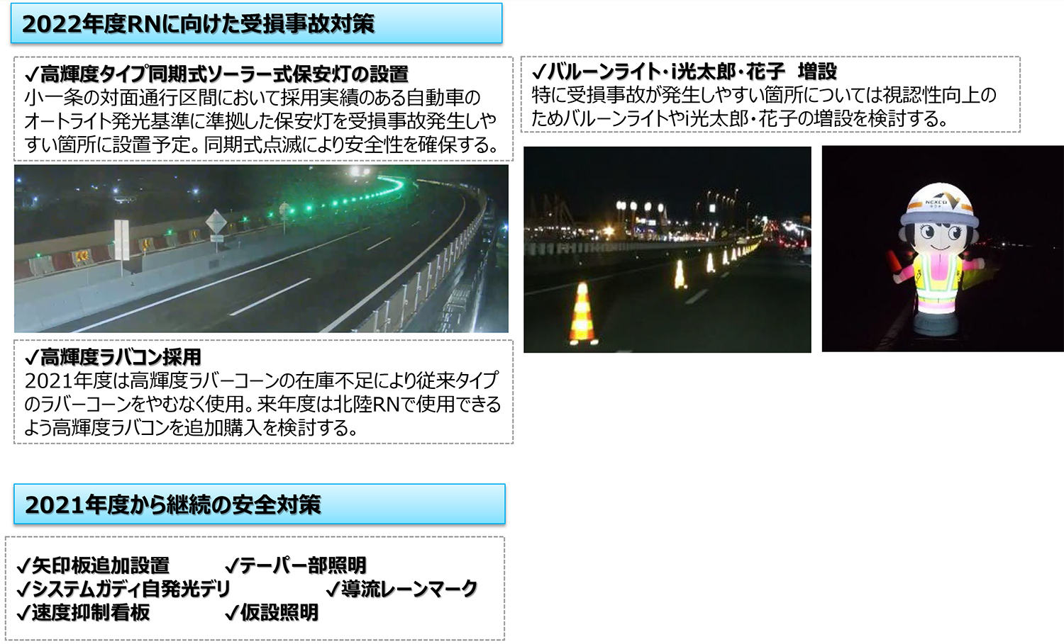 末吉 使用しています。その他、仮設LED板による注意喚起や、高輝度保安灯の設置、規制テーパー部でのバルーンライト・i光太郎・花子の設置、車線分離標の幅広カバーの装着等規制の視認性向上を図っております。大規模更新事業は取替技術の追求と規制方法の追求が2大テーマになっています。
