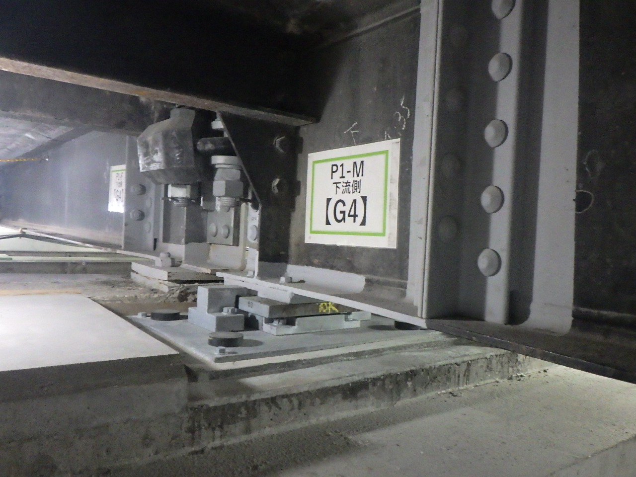 森山 支承取替(分散、免震)、ゲルバー部連続化、当て板補強(アーチリブ・橋門構))、粘性ダンパーの設置などを行っています。施工は完了しています。