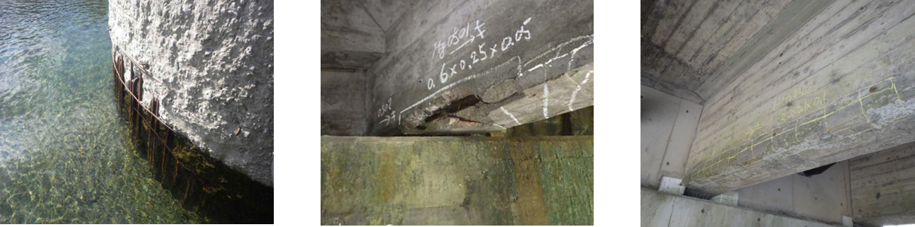 コンクリート部材の損傷状況(左から国道32号吉野川橋橋脚部、33号ひらばた橋桁部、55号須川橋桁部)