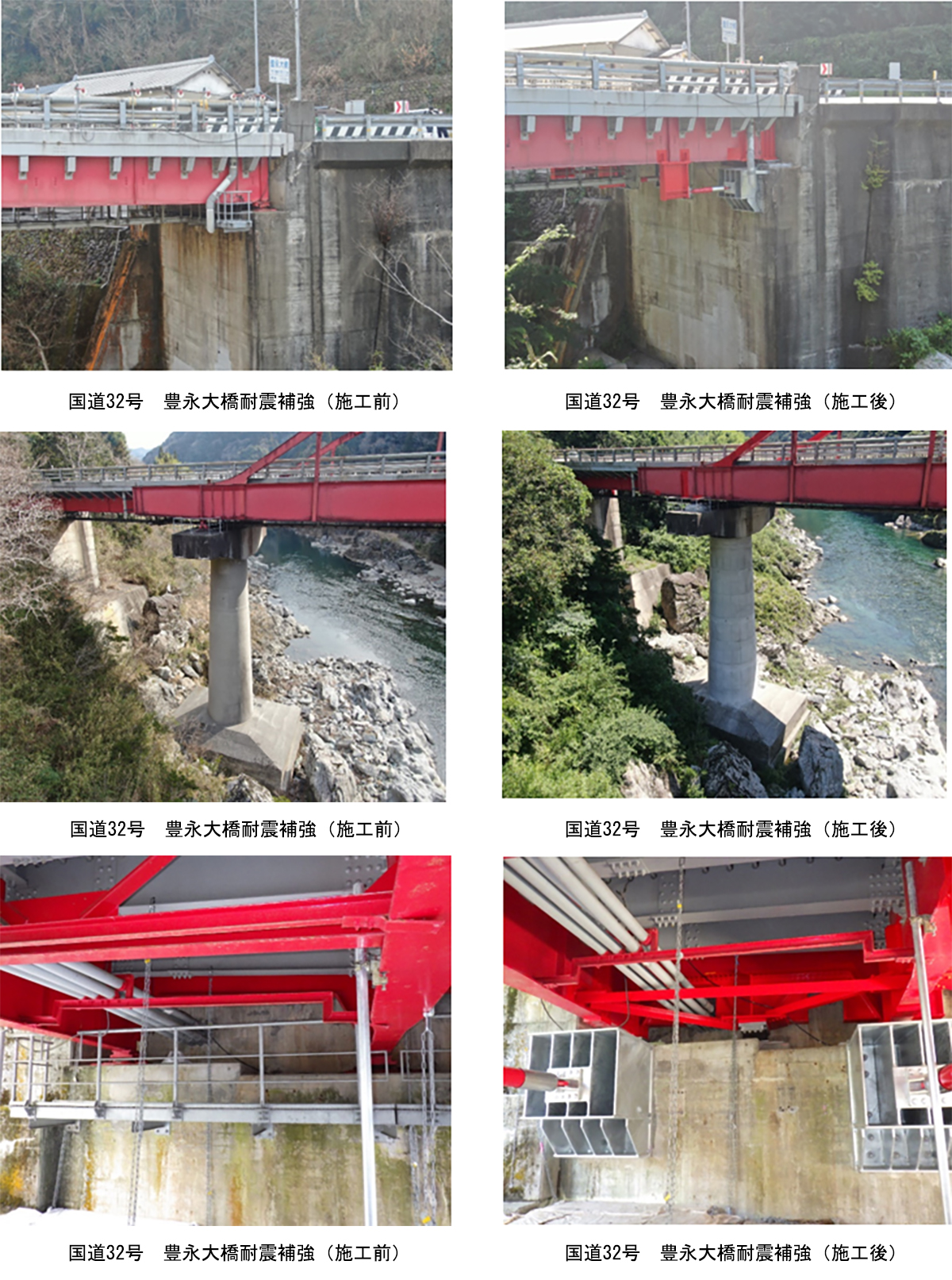路線別では国道32号が92橋、33号が102橋、55号が301橋、55号(自専道部)が31橋、56号が109橋、56号(自専道部)が13橋、四国横断自動車道が16橋です。