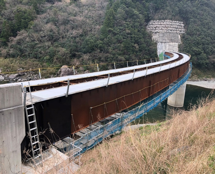 森山 越知道路において施工している横倉大橋、立花大橋は耐候性鋼材を活用し、桁端部を塗装しています。