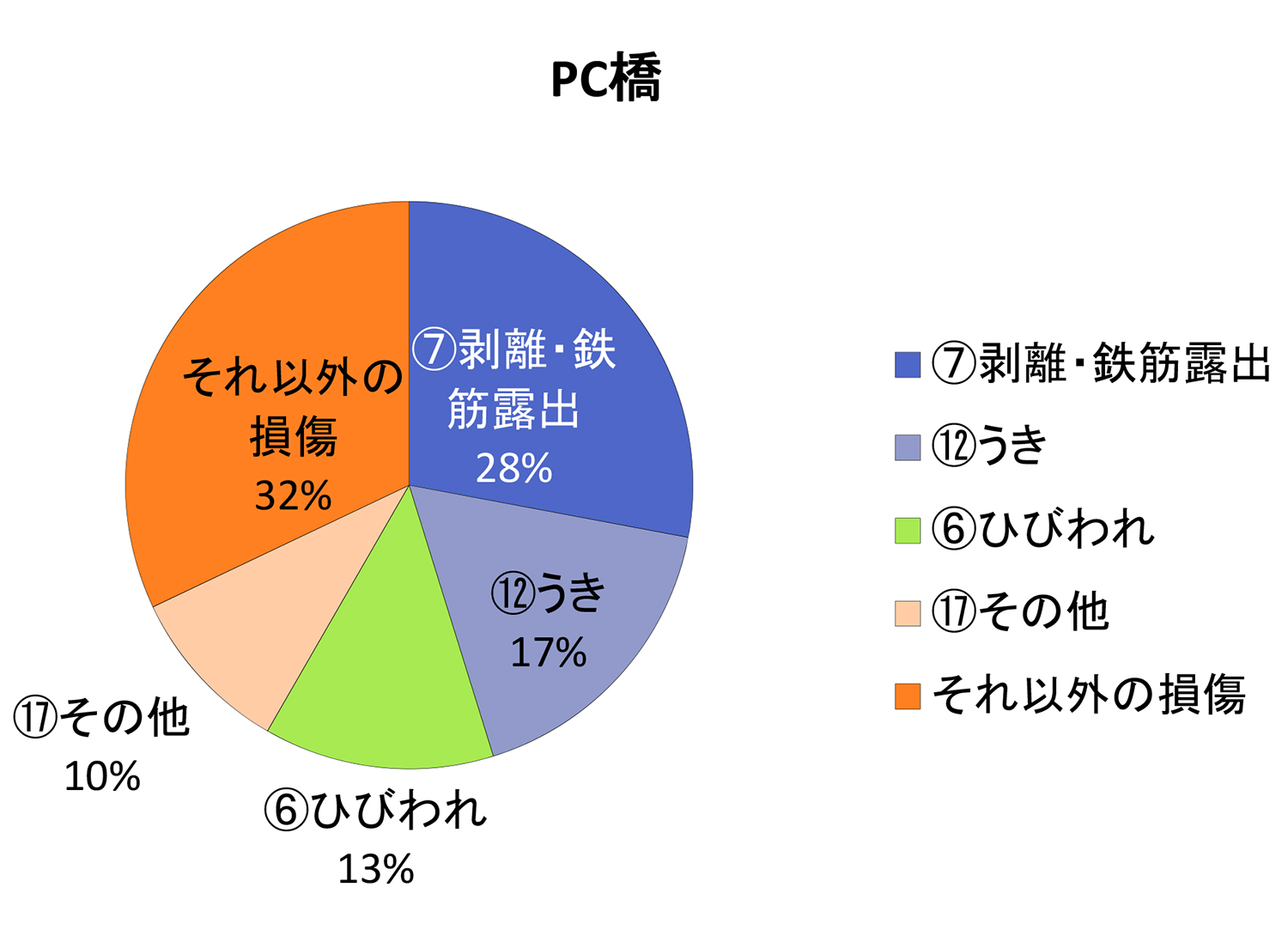 望月 鋼橋では健全度Ⅲが20%、健全度Ⅱも39%あり、腐食による損傷が顕著です。また、PC橋では健全度Ⅲが5%、健全度Ⅱが約33%で、剥離・鉄筋露出、うき、ひび割れが顕著です。RC橋は健全度Ⅲが3%、健全度Ⅱが29%で剥離・鉄筋露出、うきが顕著です。