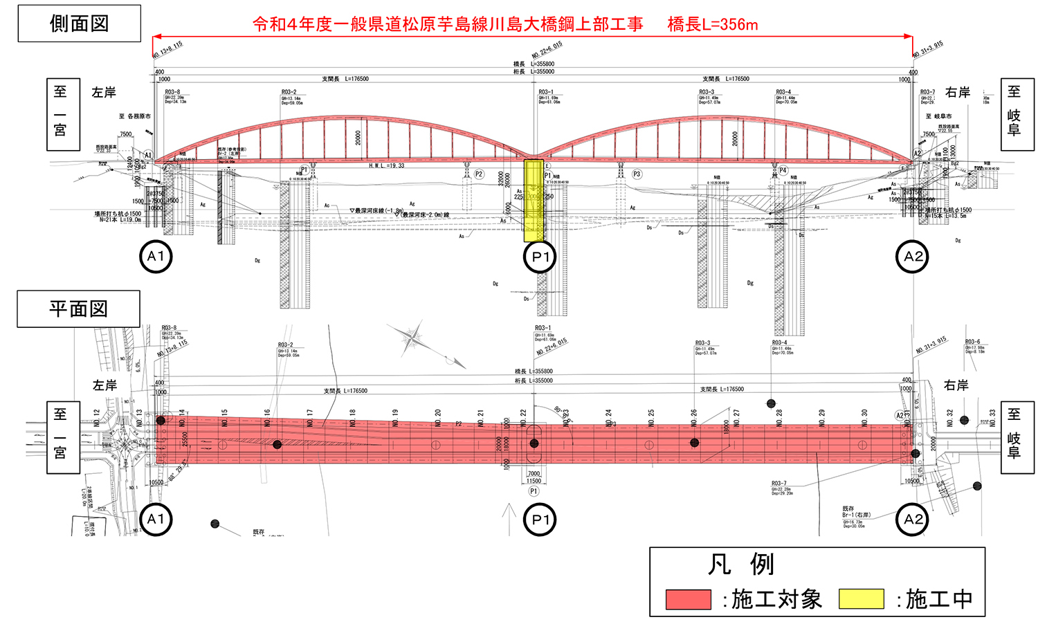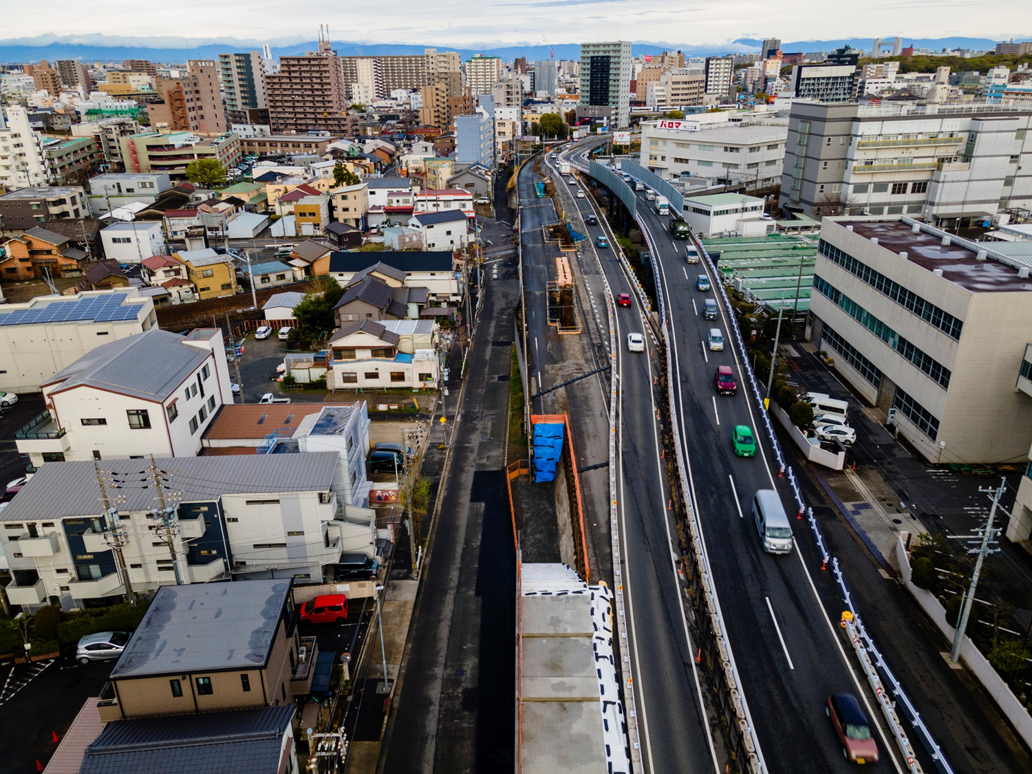 望月 まず、国道1号熱田伝馬橋架替事業があります。同橋は1950年に架設された橋梁であり、架設後73年が経過しています。同橋は現在の国道1号の橋梁の中で、最も古い橋齢となっています。老朽化も進み、耐震性能的にも課題があることから、2008年度から事業化し、架替えを進めています。現在は上り線側に仮橋を設置し、現橋の上り線を下り線として使用して、現橋の下り線の撤去を進めている状態です。