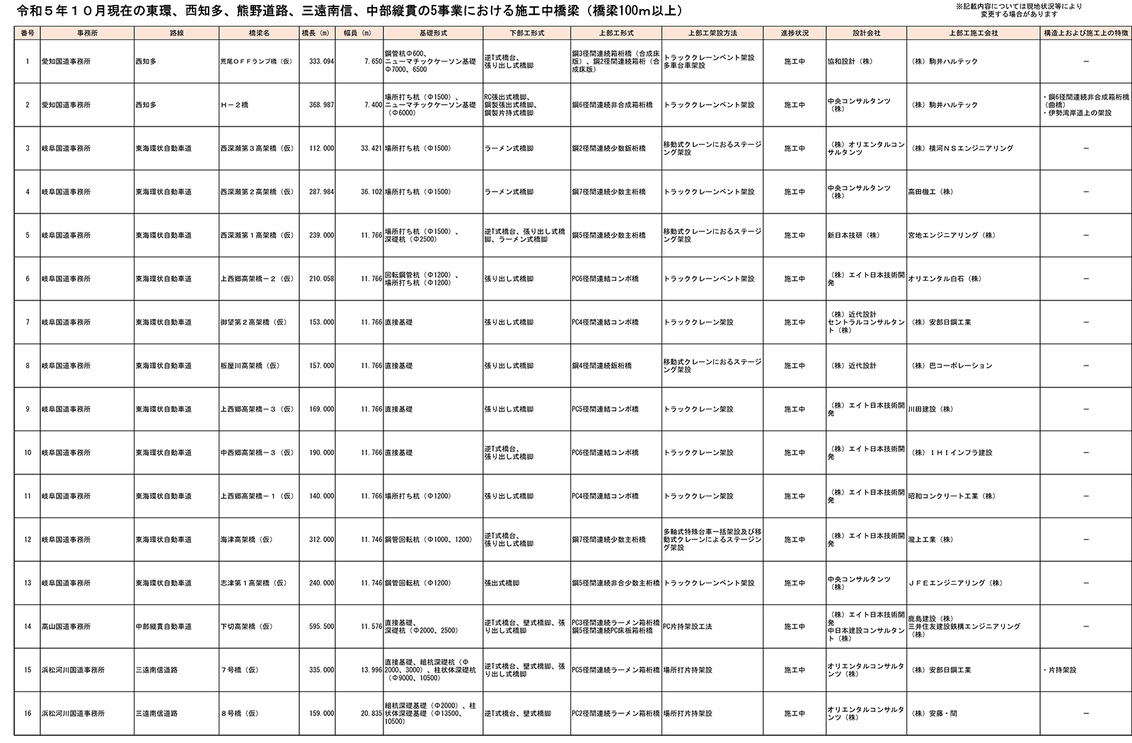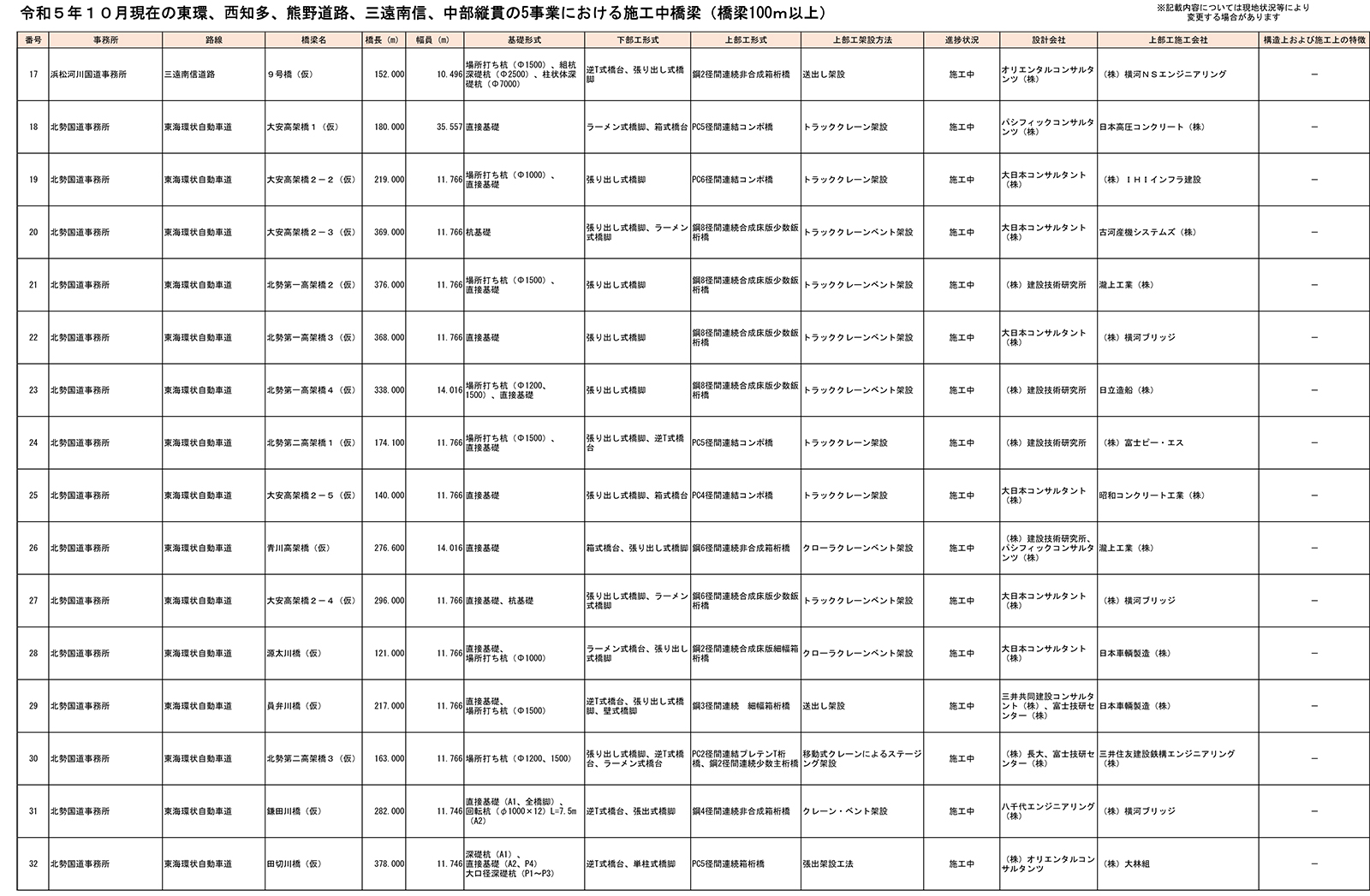 施工中の大規模橋梁上部工は32橋、トンネルは5工事を施工中