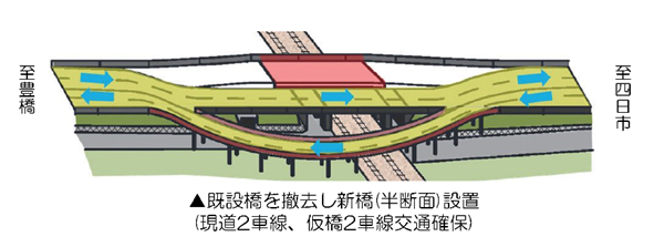国道1号熱田伝馬橋架替え 仮橋を設置して半断面ずつ施工