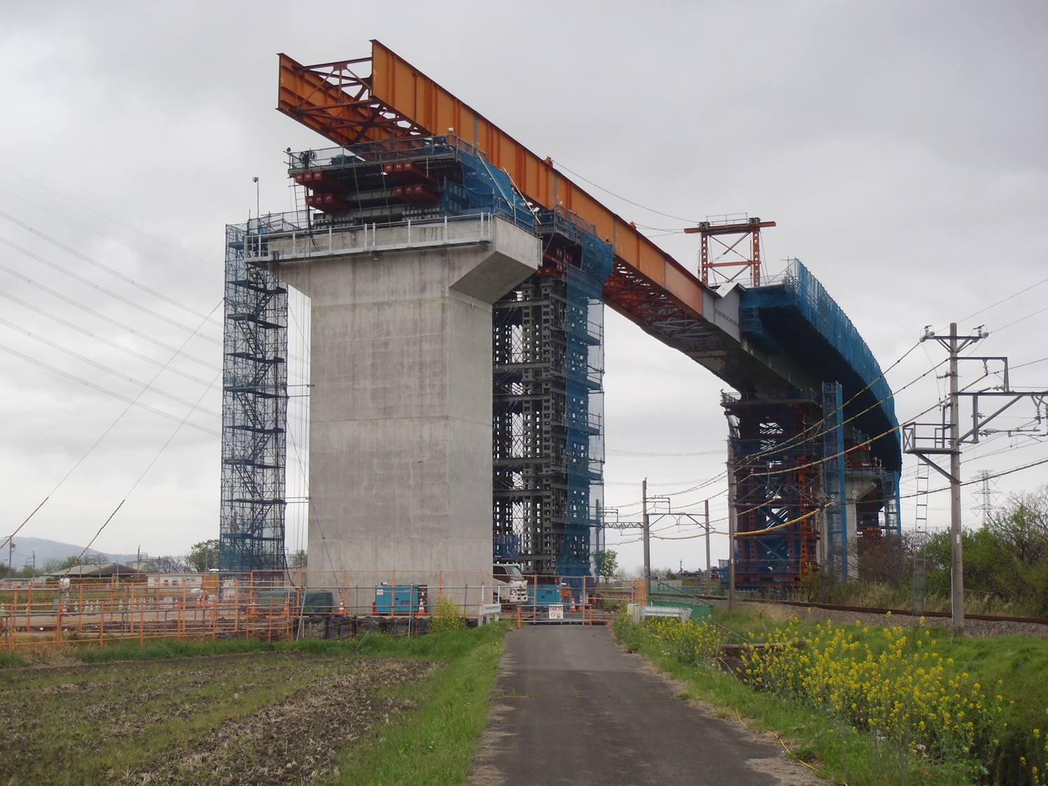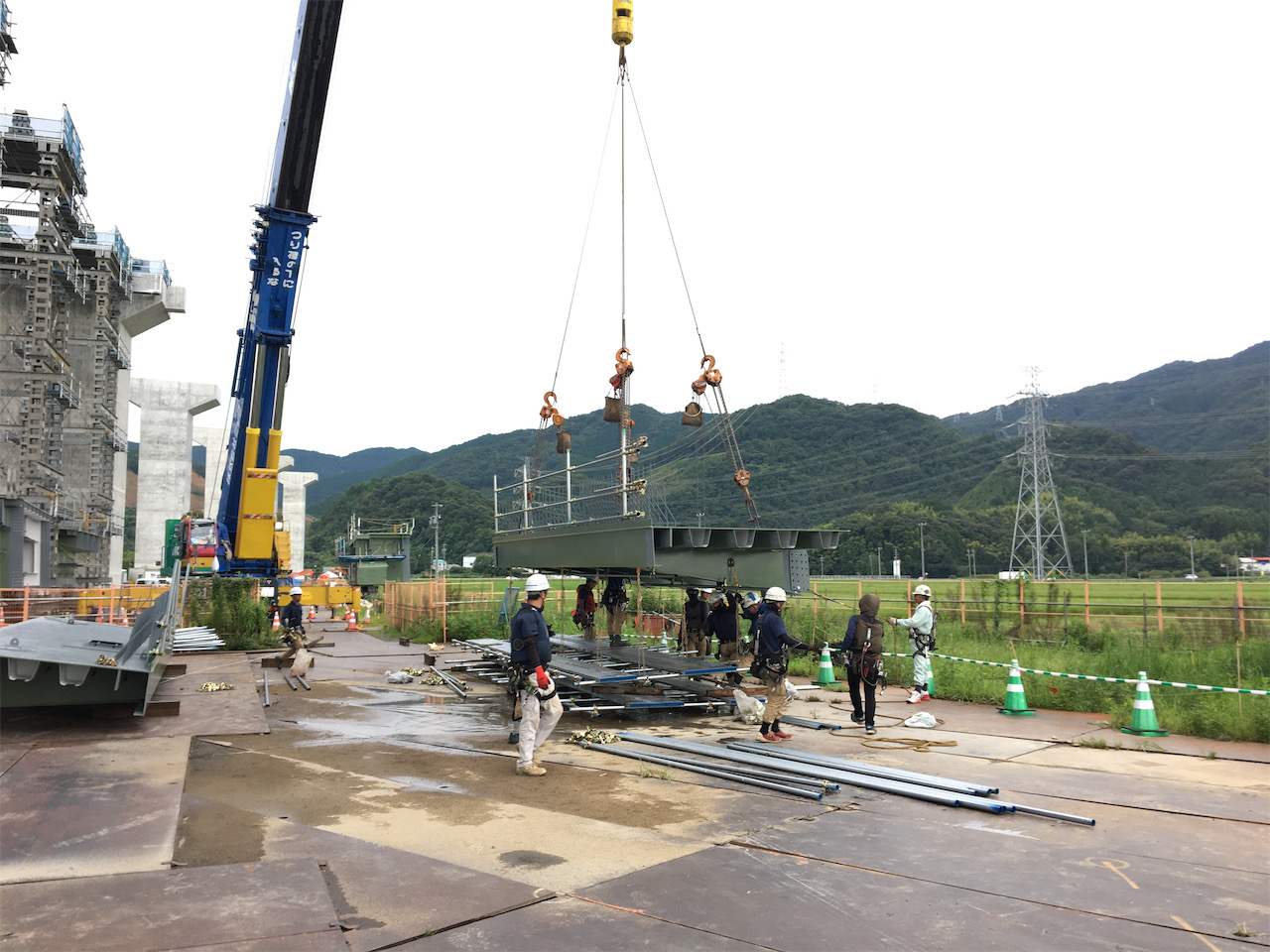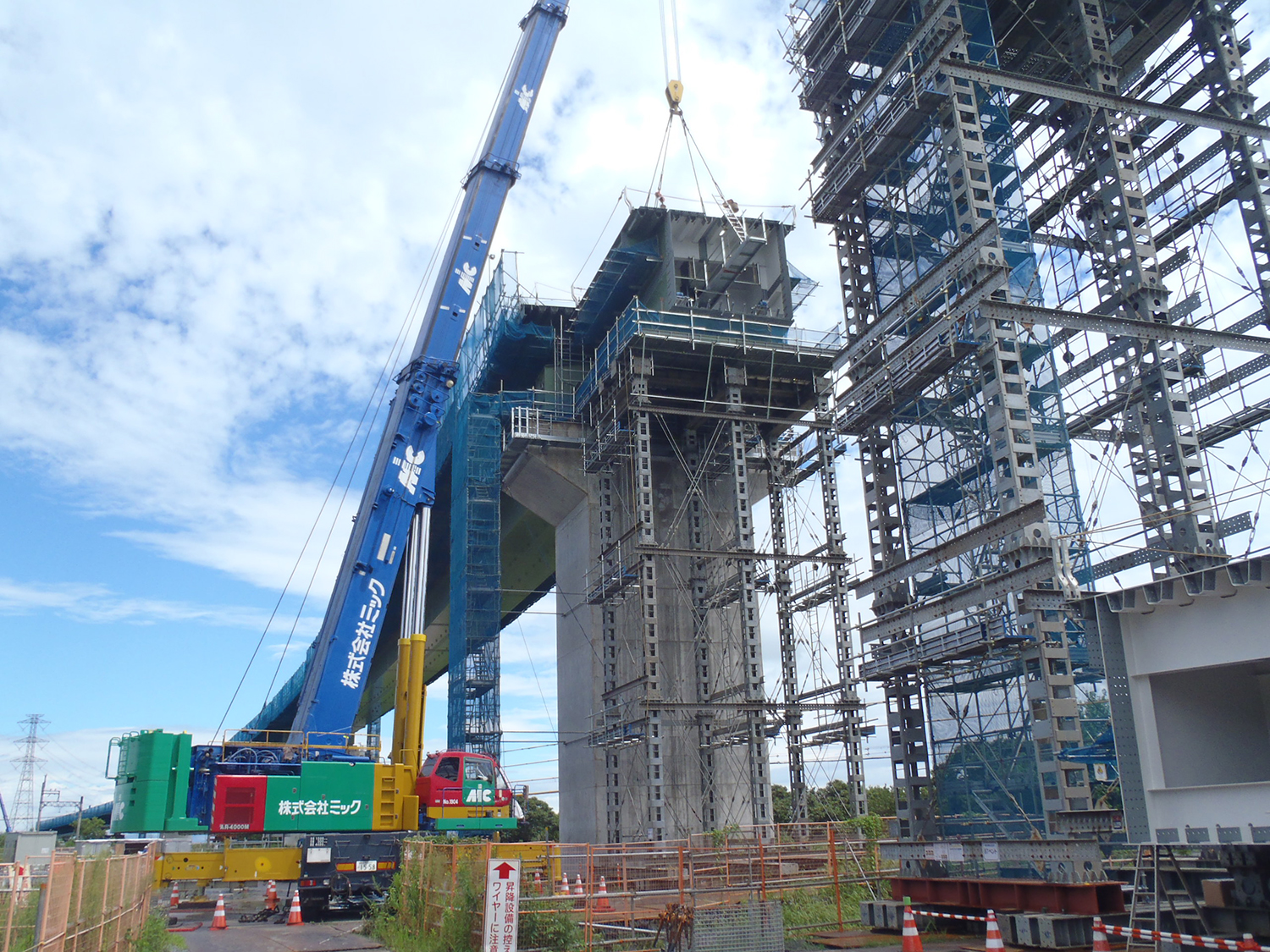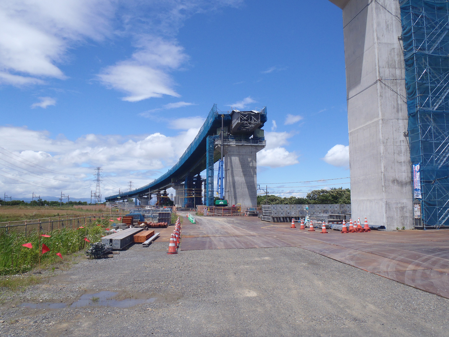 また、東海環状自動車道では、特徴的な橋梁として、施工は終えていますが、津屋川橋があげられます。同橋は橋長574mの鋼5径間連続鋼床版箱桁橋ですが、河川や道路、養老鉄道、中部電力高圧線など、交差するインフラが多くあり、架設地点に大型クレーンが配置できないことから、陸上部としては国内最長となる658m(手延べ桁含む、本桁部は中央3径間の421m)の送出しを行いました。送出し鋼重は875tと大きく、さらに支間長は最大で159m、縦断勾配は5%、横断勾配は3%、曲線半径は1,100mと厳しい条件でした。送出し施工は急速施工が可能となるダブルツインジャッキとPCケーブルを用いて桁をけん引し、各支点上に設置したエンドレス滑り装置を用いて、桁の反力を支持しつつ送り出しました。