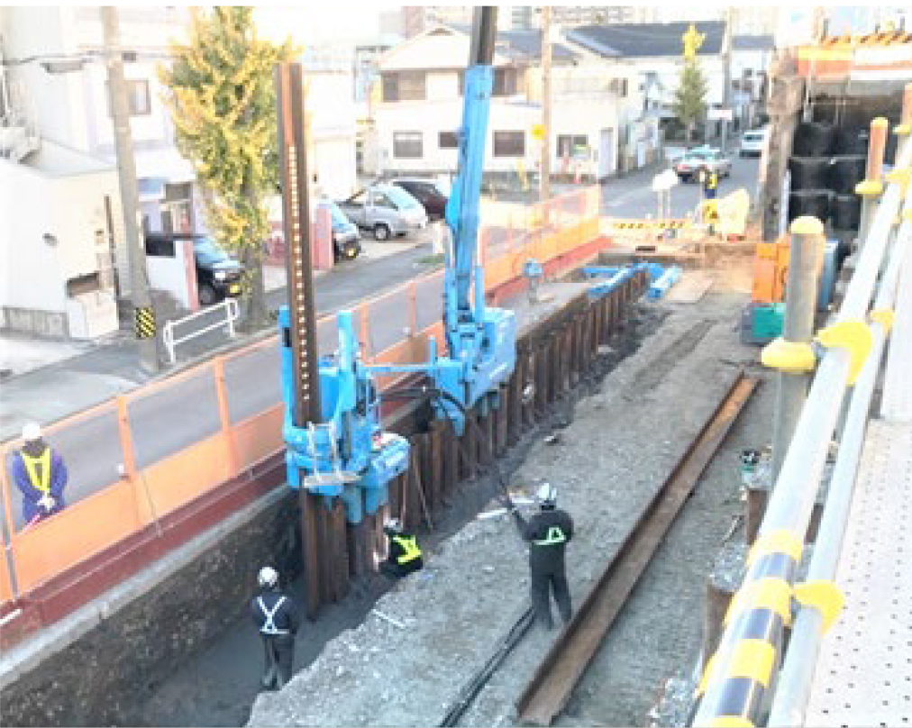 また、同事業は橋梁だけでなく周辺の盛り土部も含めた事業としています。これは盛り土部の地盤に液状化の傾向があり、耐震性に課題があることから排水機能付き鋼矢板を打設することで、液状化しにくくする対応を施しています。