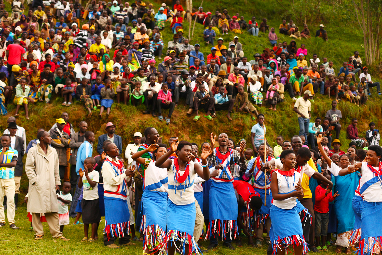 歩行用の簡易吊橋(三井住友建設提供)/完成を祝う人々(Bridges to Prosperity 提供)