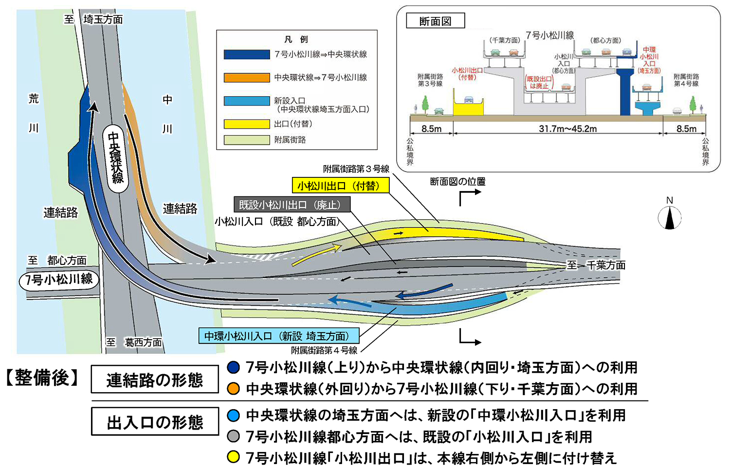 一方、中央環状線方面に行く導線は、これも同じで、現状の小松川入口がセンターランプで7号小松川線本線に対して右から合流していく形態になっています。ここから中央環状線に行くには距離が不足しているということもあって、中央環状線方面の入口(中環小松川入口)を新たに設けまして、そこからJCTをご利用いただくという形態になっています。