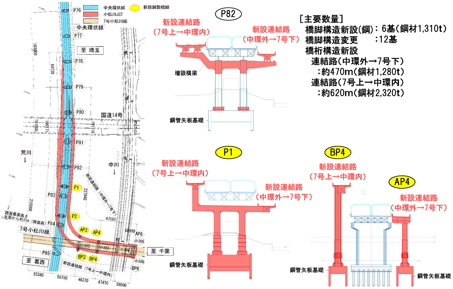 高橋 2015年3月に全線開通した中央環状線の機能をさらに向上させるために、現在接続されていない中央環状線と7号小松川線とを連結する小松川JCTを設置する工事です。特に中央環状線の埼玉方向と7号小松川線の千葉方向は交通需要が多いと予測されており、この方向を結ぶ連結路が設置されることにより、首都高速道路ネットワークがより強化されるものとなります。小松川出入口において中央環状線(埼玉方面)との出入りが可能となるよう、入口を追加するとともに、現在の出口を7号小松川線の北側に付替えます。また、これらの整備に伴い、7号小松川線の附属街路第3号線、第4号線を付替えます。これらは中央環状線のジャンクションの機能が不足している箇所への連結路の追加等を行うものです。