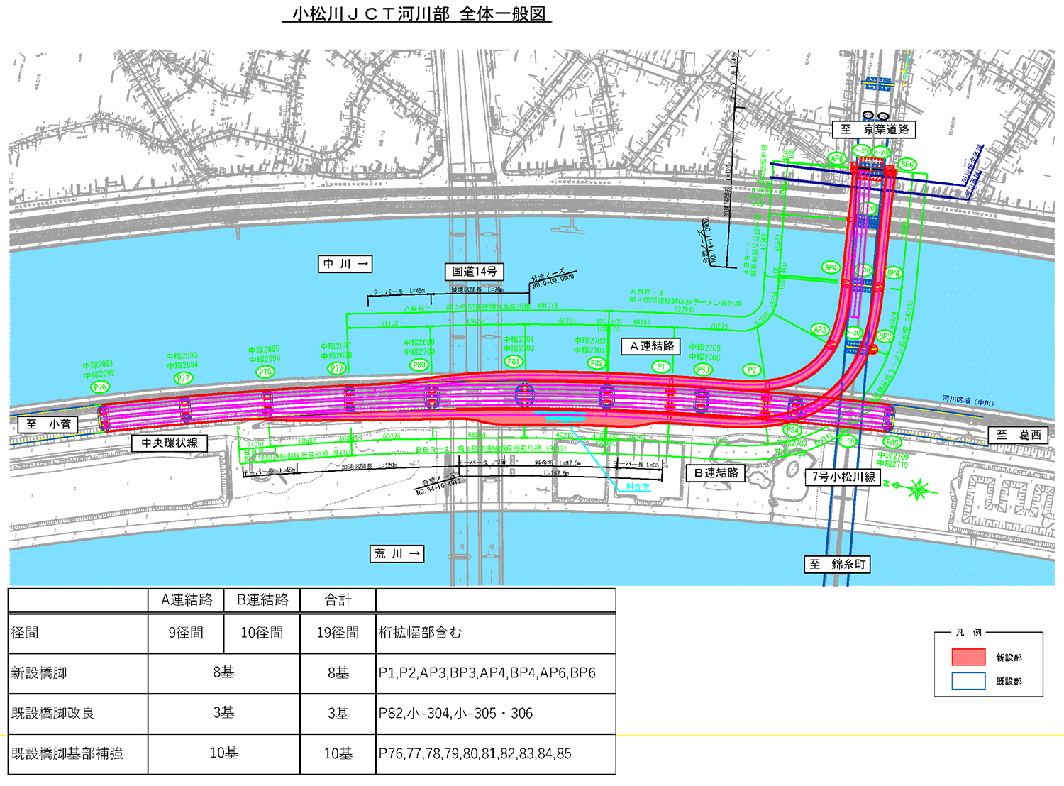 高橋 河川部の範囲は、中央環状線の接続部から中川を横断する最初の橋脚までとなります。連結路を支持させる橋脚はたくさんありますが、P1、P2、AP3、AP4、BP3、BP4が新たに新設した基礎橋脚となります。