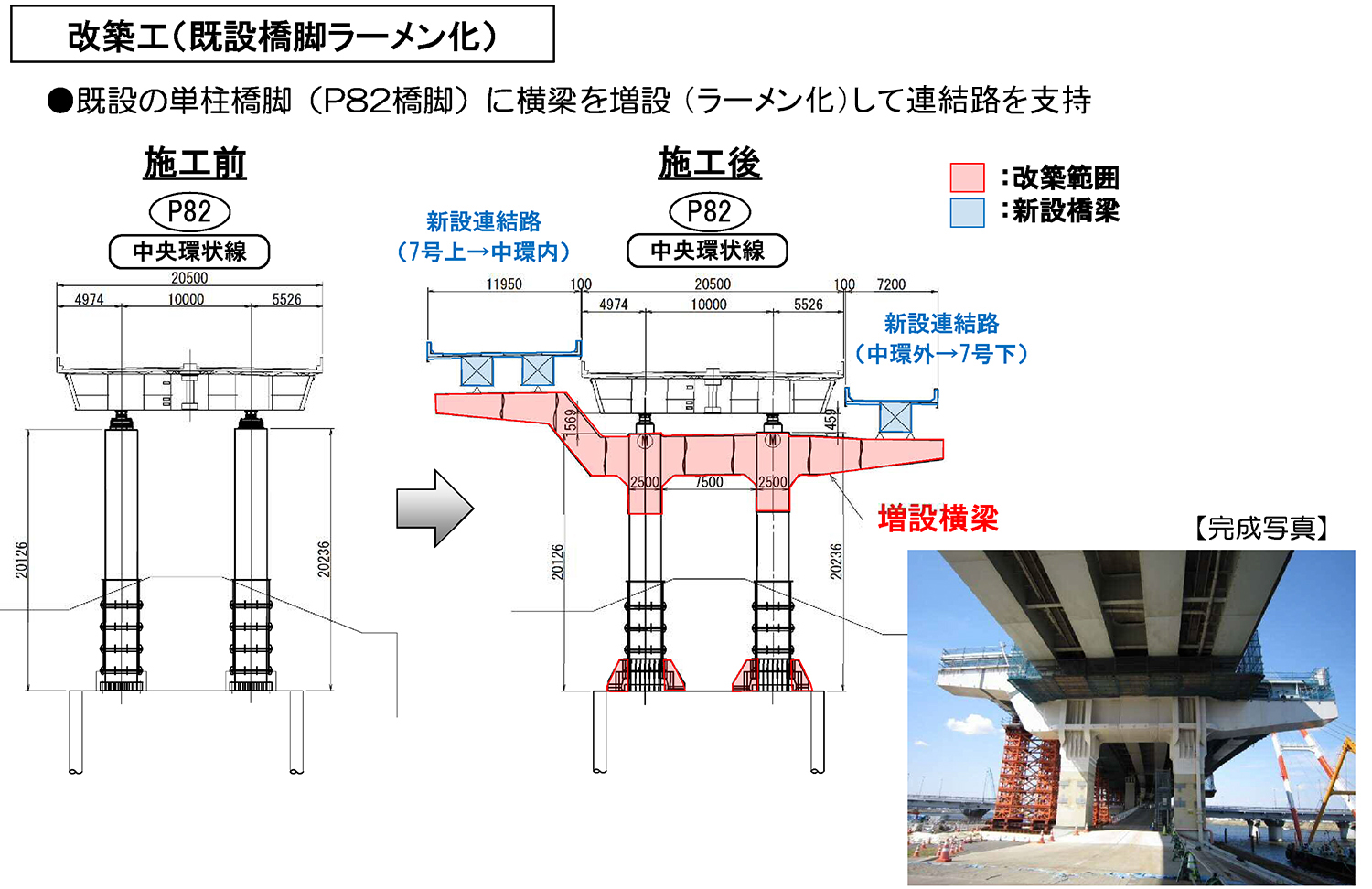 大きな特徴はP82橋脚です。既設橋脚で鋼管矢板基礎上に2柱の橋脚が立っていて、その上にピポット支承があり箱桁を支持している構造で、それが中央環状線の既設構造です。既設基礎と橋脚を活用して連結路の橋桁を支持させるために、ラーメン化と称していますが、2柱の橋脚を連結させて、さらに横梁を張り出させています。これは、新設の基礎と橋脚を減らして既設構造を生かすことによって、河川構造物への影響を最小化するためです。