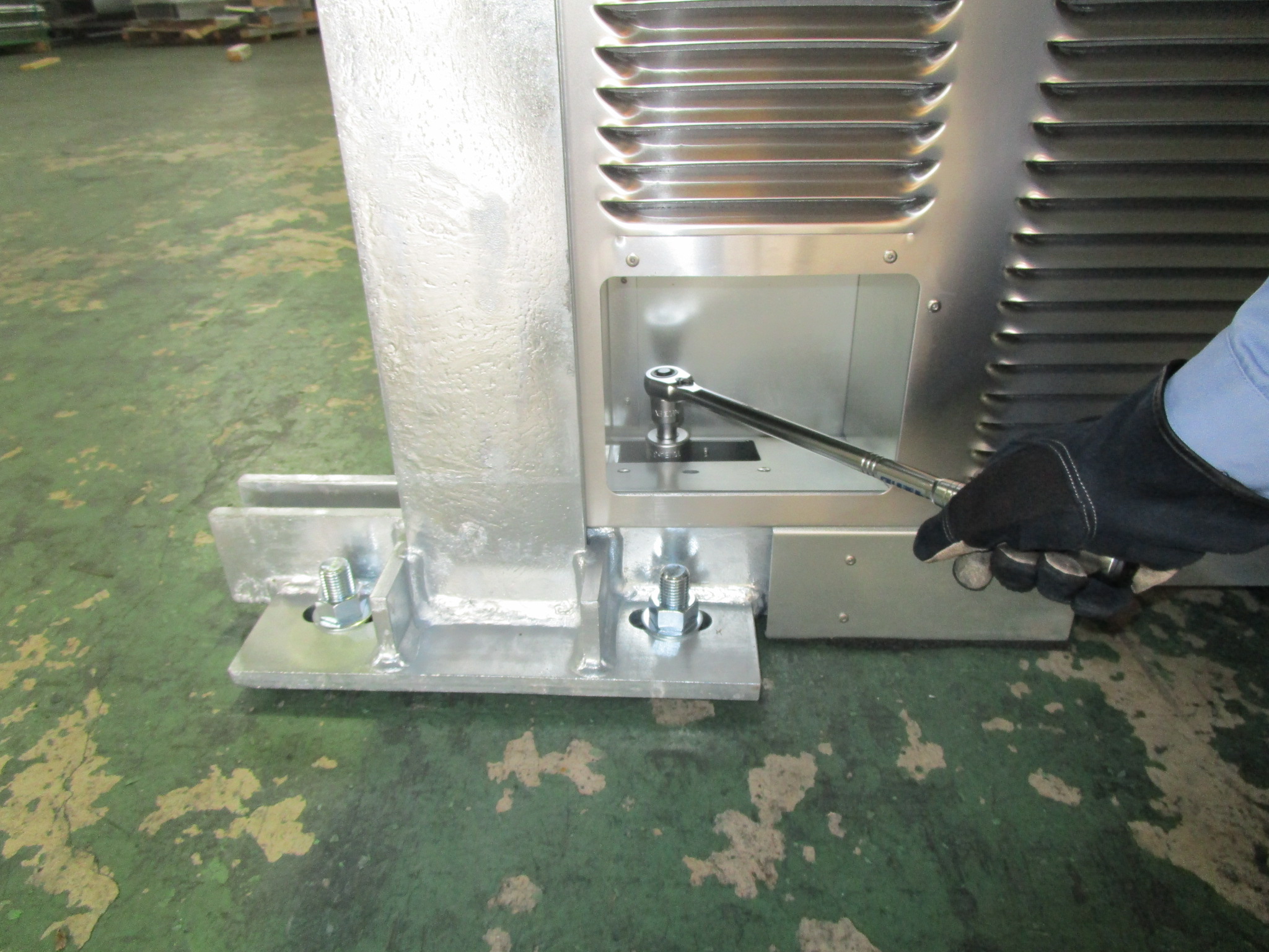 加えて、現在、遮音壁の維持管理においては、国交省の指針で遮音壁支柱のアンカーボルトについても5年に1回の点検を義務付けられていますが、現在の遮音壁支柱アンカーボルトは、橋上から見て道路側は点検できるものの、背面側のアンカーボルトは道路側から点検することができず、橋梁点検車などを利用するしかありません。そのため新たに道路側から全てのアンカーボルトを点検できる点検口付き金属製遮音板をラインナップし、さっそく、この2月末に国交省の広島国道事務所の高架橋で初採用されました。
