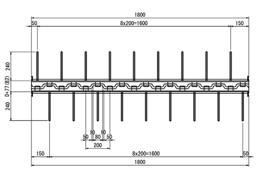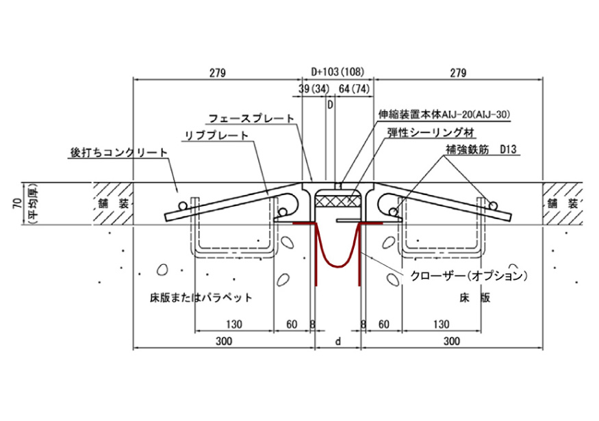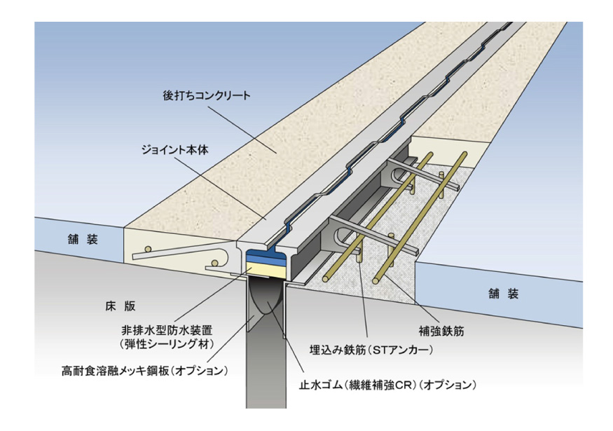 定着リブを従来の孔あきリブプレートから釣り針型の特殊形状に変えることで、ジョイント高さを65㍉に抑えため、RCおよびPC床版やPC桁といった構造物材の端部の箱抜が不要であり母材への影響を回避できる舗装厚内での設置を可能とし、工期も短縮できる。