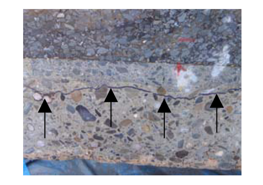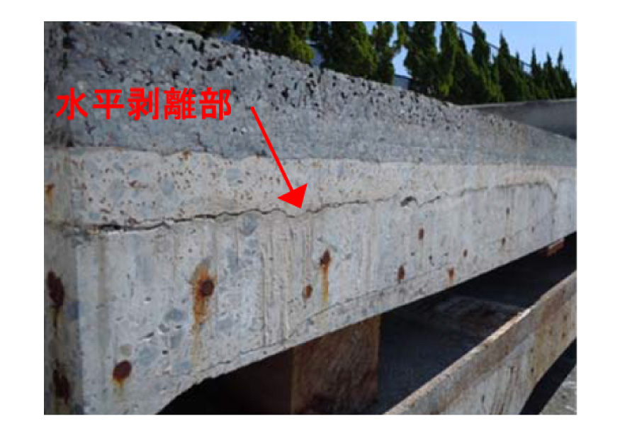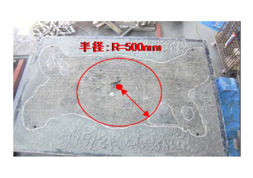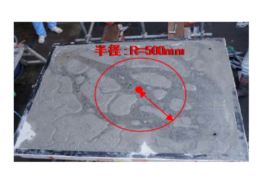 また、充填方法については本工法では床版下面から剥離部まで削孔するため、全ての剥離部への注入が可能としている。従来工法では、剥離部の注入を目的にしており、床版上面からの削孔長が剥離部までとなる。実際の床版内は鉄筋部の剥離も生じているため、全ての剥離部に対して注入することができなかった。加えて、エポキシ系、アクリル系ともに0.3MPaを上限として注入した結果、二重、三重になっている部分も含めて全ての空隙に樹脂が充填できることを確認。注入後の試験体に行った押し抜きせん断試験でも2~4N/平方㍉と、所定の性能を有することを確認している。
