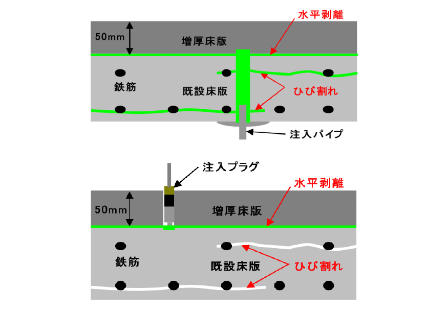 ケミカル工事は西日本高速道路、西日本高速道路エンジニアリング関西と共同で、RC床版における増厚部と既設床版との界面に生じている水平剥離をWJできれいに洗浄した後に、床版下面から樹脂を低圧注入し、水平剥離部を充填する『上面増厚床版剥離部補修システム』を開発した。全て桁下で施工するため交通規制を必要としないことが大きなメリットだ。また、高速道路リフレッシュ工事期間外に施工が可能なため、年間を通じての工事の平準化が図ることができ、未充填箇所への再注入など不足の事態でも対処が可能。