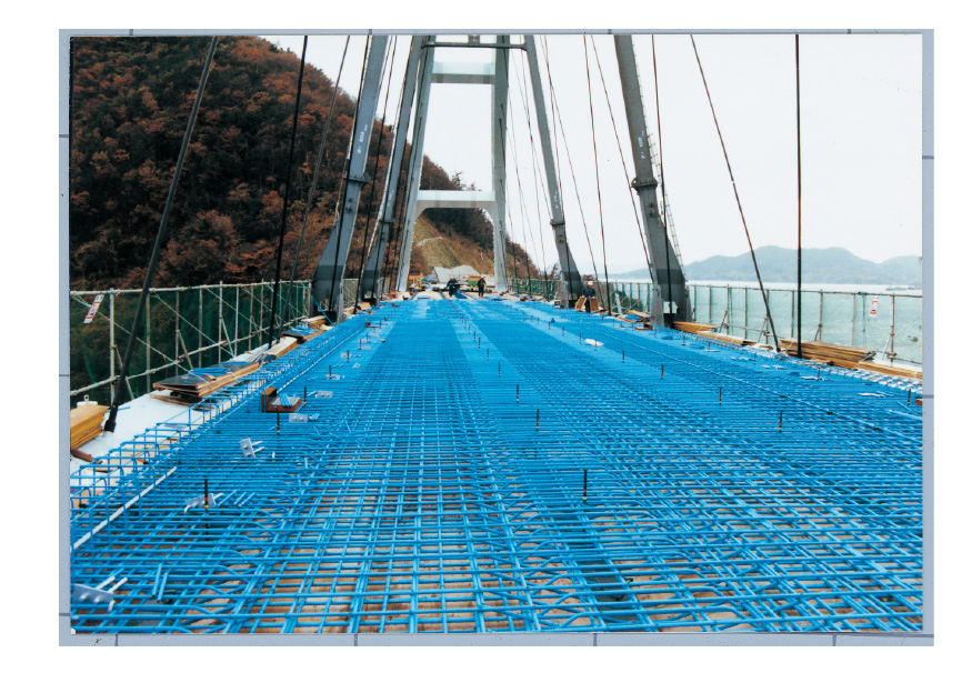 安治川鉄工のエポキシ樹脂塗装鉄筋「AG-エポキシバー」は、1984年の発売以来30年間で5,000件30万㌧の納入実績を誇るコンクリート構造物の塩害対策用防食鉄筋だ。土木用途の主な実績としては本四架橋の瀬戸大橋、明石海峡大橋、北陸自動車道の親不知高架橋、北海道開発局の大森大橋、沖縄の古宇利大橋など日本全国に跨っている。