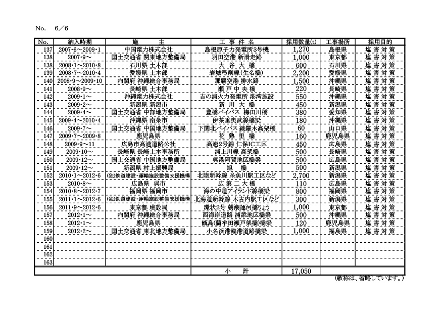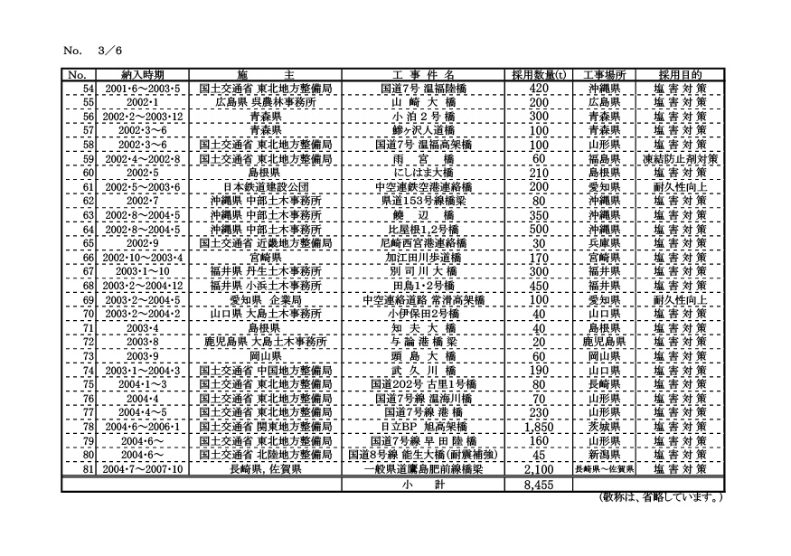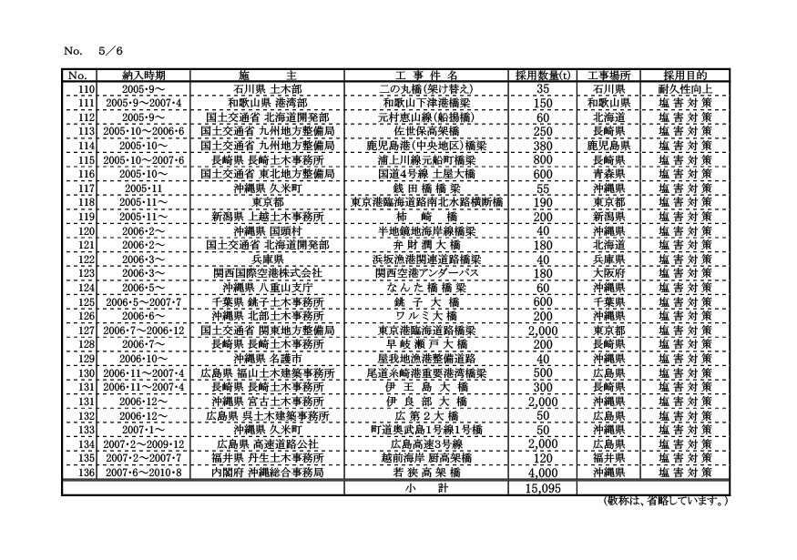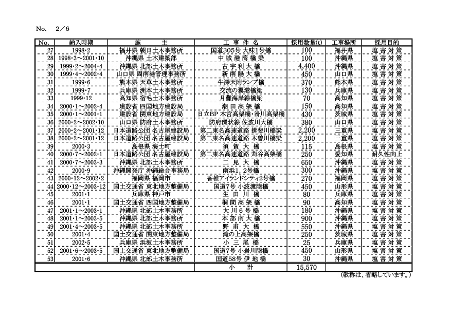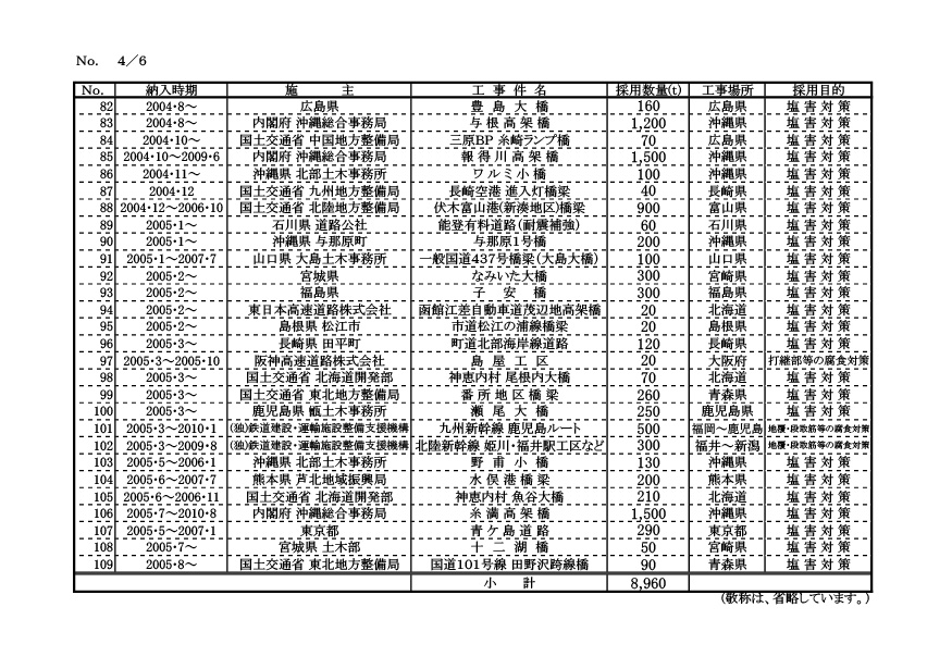 また、実橋では大森大橋と源河橋で追跡調査している。大森大橋は北海道開発局小樽開発建設部が所管していたPC橋で、2004年晩夏に異常気象による大雨と強風、満潮が重なって落橋した橋桁を調査した結果、「エポキシ樹脂塗装鉄筋は腐食などが起きず、極めて健全であったことが確認されている」。また、源河橋は沖縄本島北部の国道58号の海岸に程近い場所にあるコンクリート橋であるが、これも「追跡調査した結果、腐食やエポキシ樹脂塗装の劣化は見られず、健全な状態が確認できている」としている。