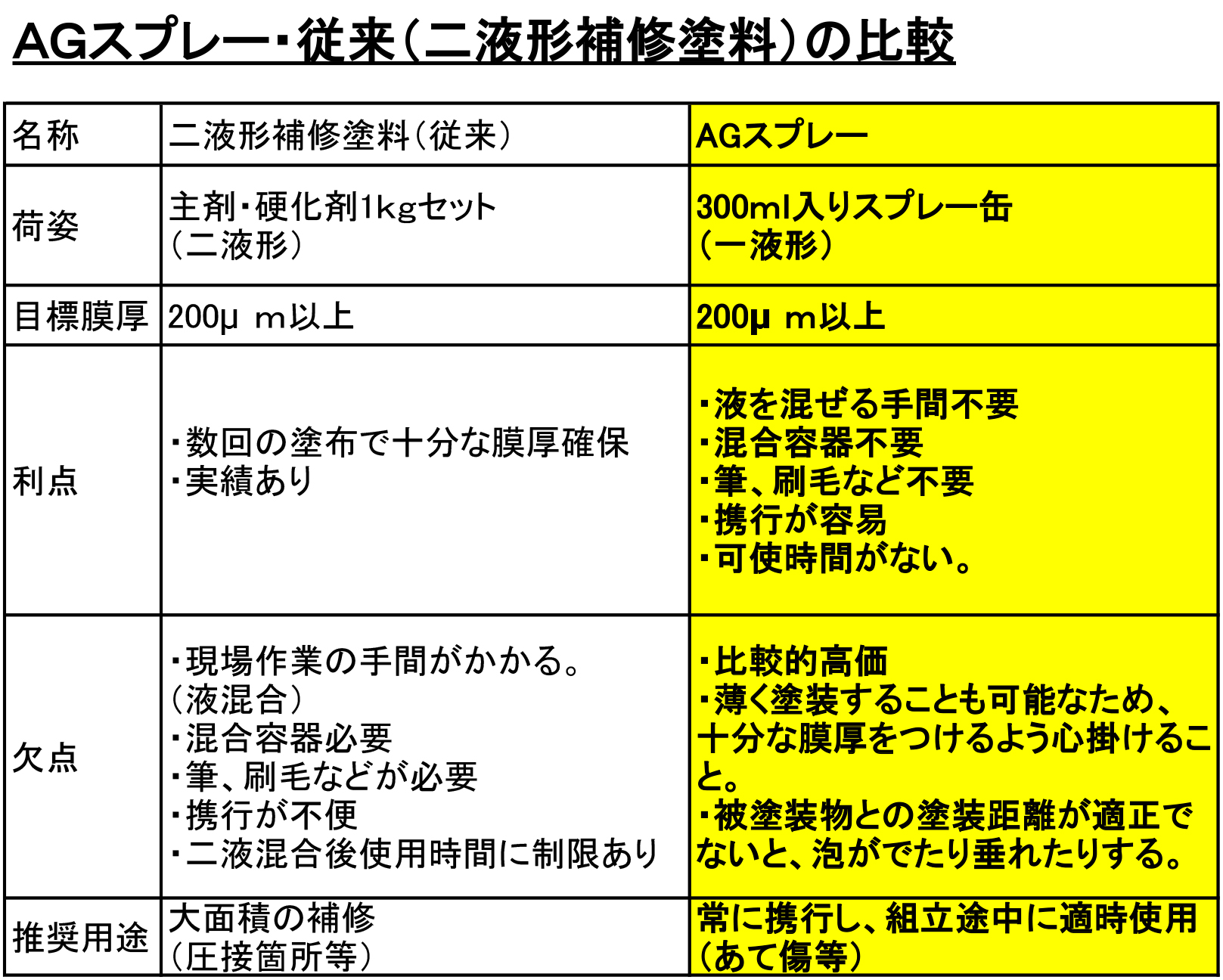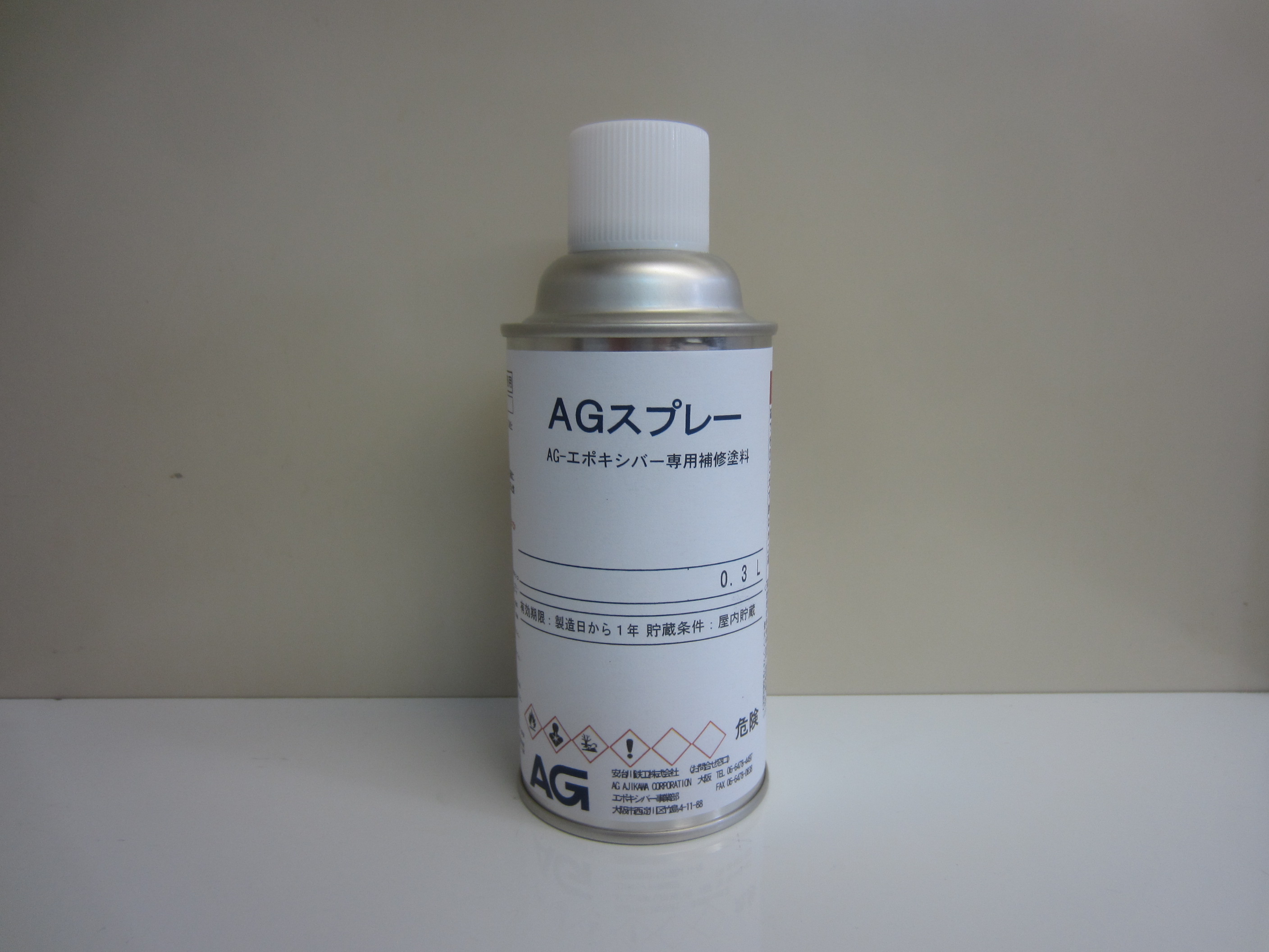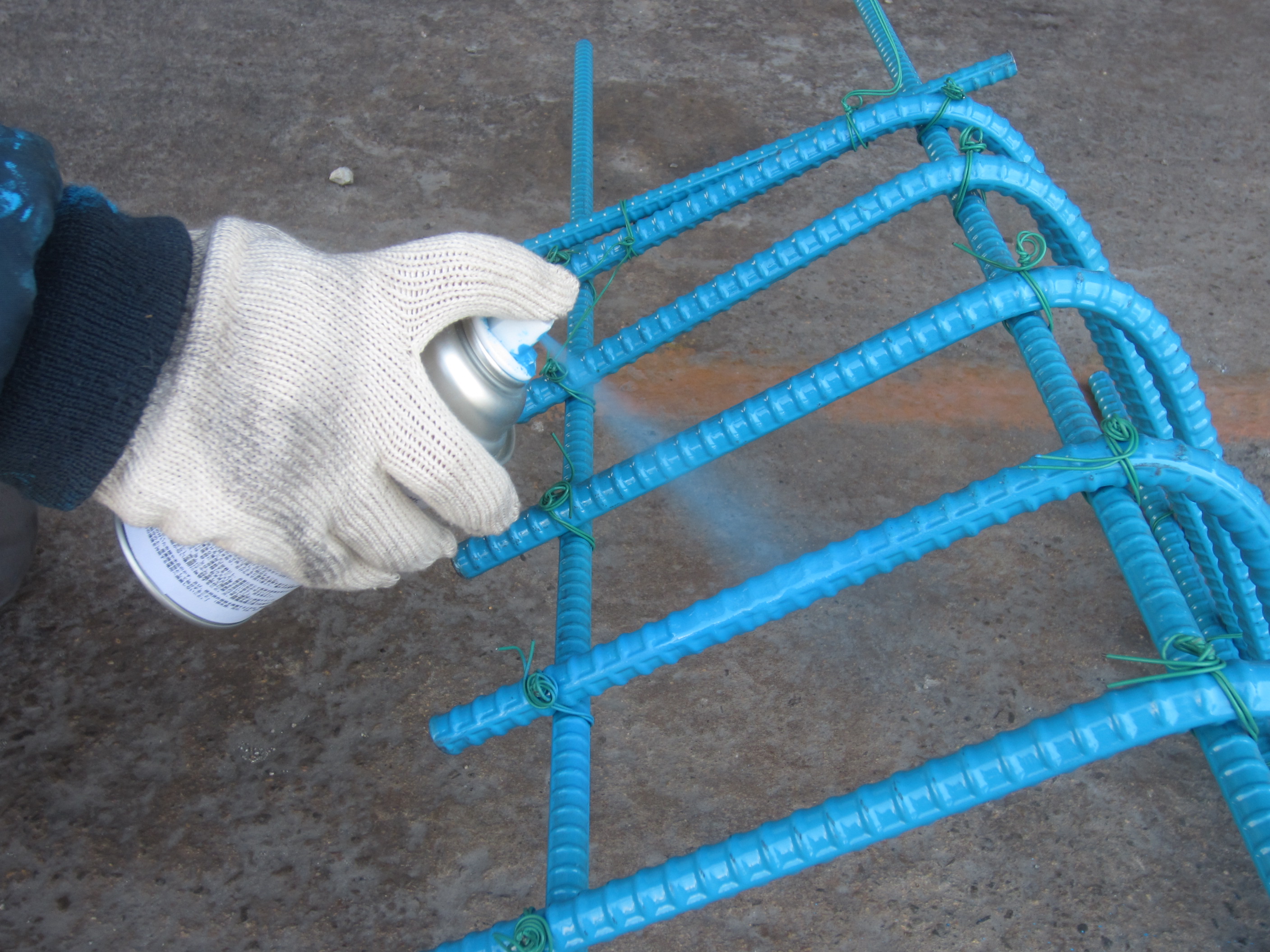 エポキシ樹脂塗装鉄筋は高い防食性能を有する一方、作業の工程で塗膜層が傷つくこともあり、そうした場合、主剤と硬化剤からなる2液型の補修用塗料を用いて刷毛塗りで施工する必要があった。従来の補修用塗料は混合後所定の硬化時間前に使い切る必要があるため、塗膜が傷ついた直後ではなく鉄筋を組んだ後などにまとめて施工する必要があるため大きな手間を要していた。AGスプレーはスプレー缶内の1液型の反応硬化型エポキシ樹脂塗料を損傷部に吹き付けるだけでよく、硬化時間に左右されないためいつでも補修することが可能。300㍉㍑のスプレー缶内に内蔵されているため現場での持ち運びも容易で、防食性能もエポキシ樹脂塗装と同様の性能が確認(土木学会基準JSCE-E105-2013に合格)されている。