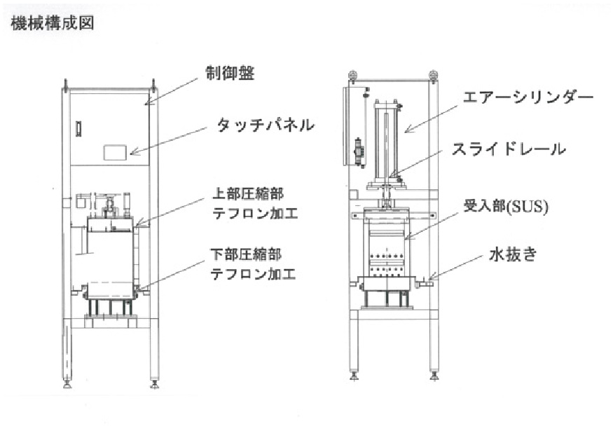ヒートプレス機の寸法は、高さ230㌢×幅80㌢×奥行80㌢。装置重量は400㌔。一度に64㍑の投入が可能で、タッチパネルで簡単に操作可能。将来的にはより大型化し、処理能力の増大を図る方針da。