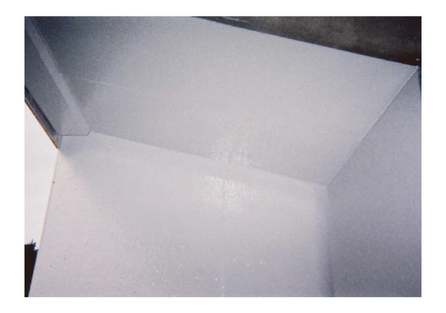 施工は施工条件により①ローラー塗り②刷毛塗り③コテ塗り④吹付けにて行う。吹付の際は飛散養生を必要とする。施工時の管理項目としては①主剤:硬化剤の適切な計量、配合、撹拌に留意する。塗布時の膜厚管理はウェットタイプの膜厚系にて適宜に塗膜厚を計測する。