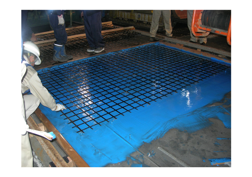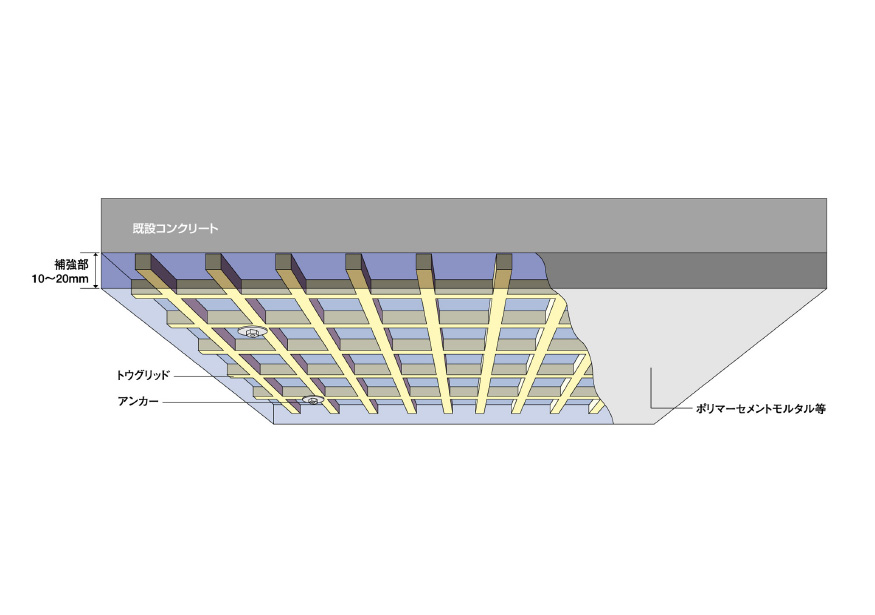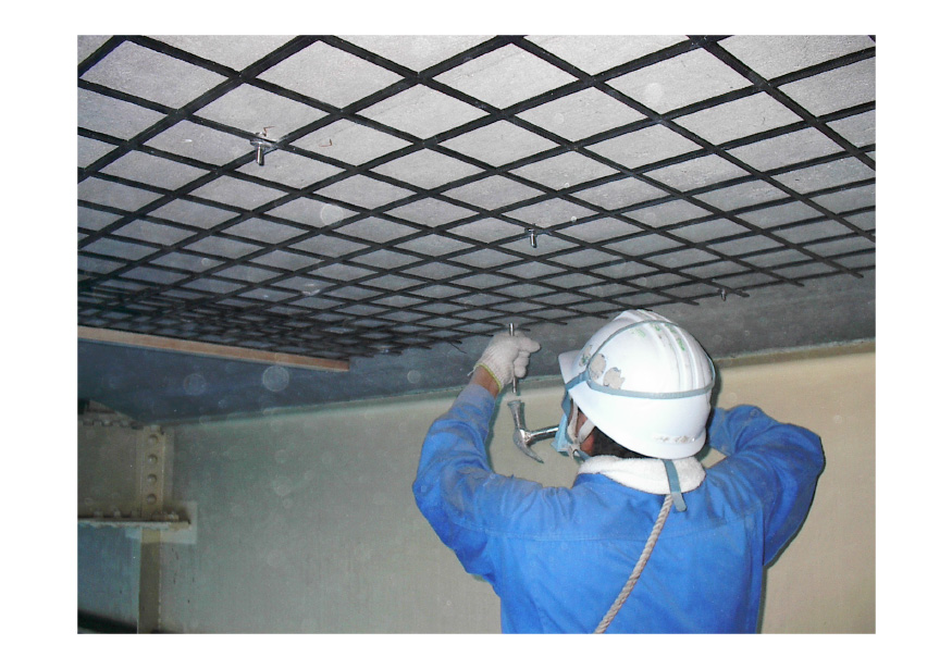 床版下面への施工例 日鉄ケミカル&マテリアル(株)は、FRPグリッドとポリマーセメントモルタルを用いる補修・補強工法である「FRPグリッド増厚・巻立て工法」を展開している。これまでに、床版、トンネル(道路、水路)、下水処理施設、建築構造物などの補修・補強で実績を重ねており、今後も老朽化による補修対応、耐震性能向上のための補強対策として広く需要が見込まれる。