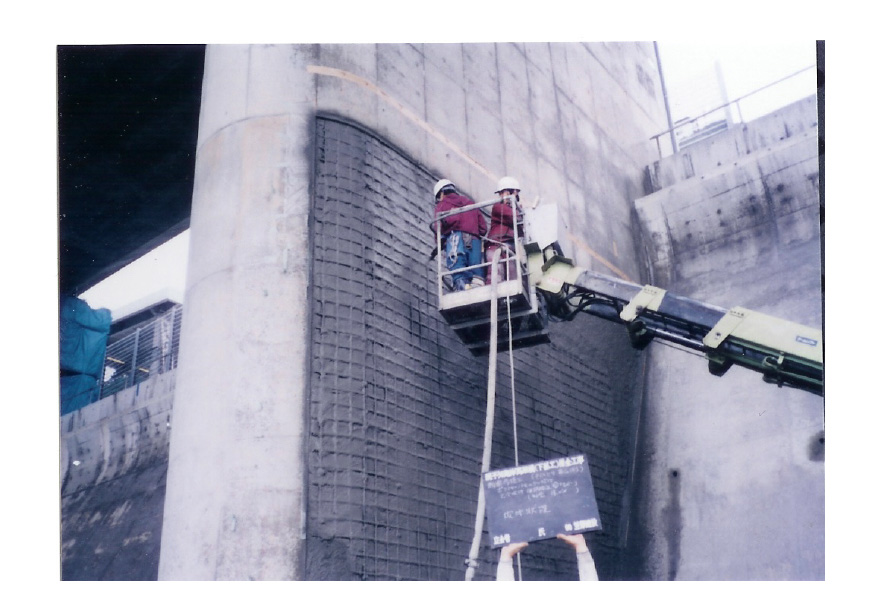 「FRPグリッド増厚・巻立て工法」は、既設コンクリート構造物において、耐久性に優れた軽量のFRPグリッドを吹付けポリマーセメントモルタルによって既設コンクリート構造に一体化させ、補修・補強をおこなう技術である。
