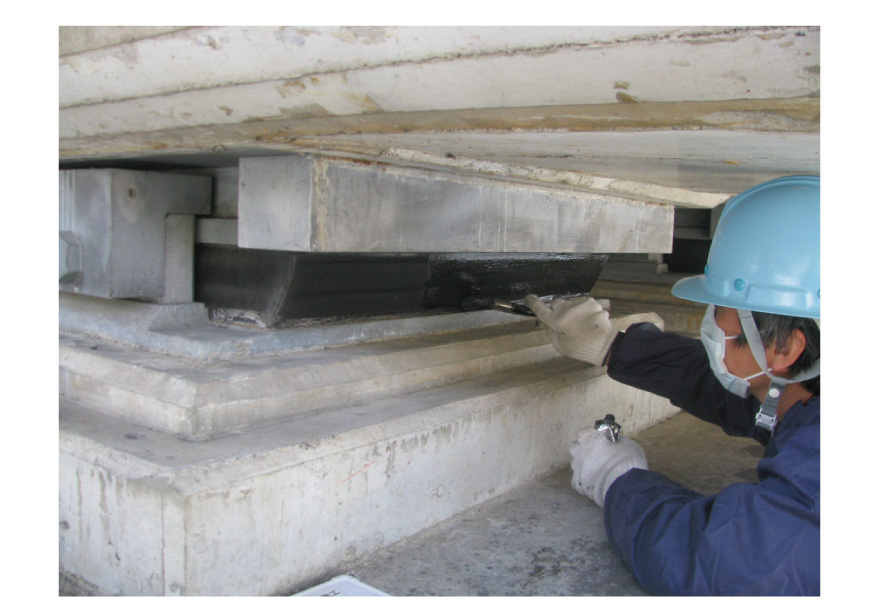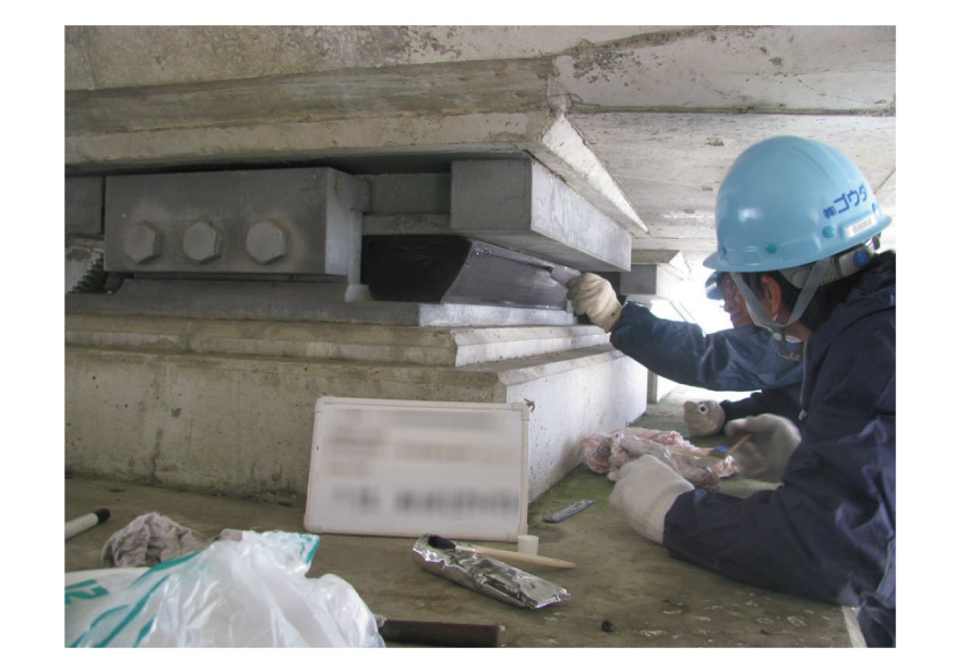 ビービーエムは大気中のオゾンに起因するクラックなどゴム支承の経年劣化の予防および劣化進行の抑制を目的として、ゴム支承用耐候性表面保護材「HBコート」を展開している。クロロプレンゴム系の一液型コート剤で、これをゴム支承本体の側面被覆ゴムに生じた傷や劣化に伴うクラックへ塗布することで劣化の予防、もしくは進行を抑制できる。