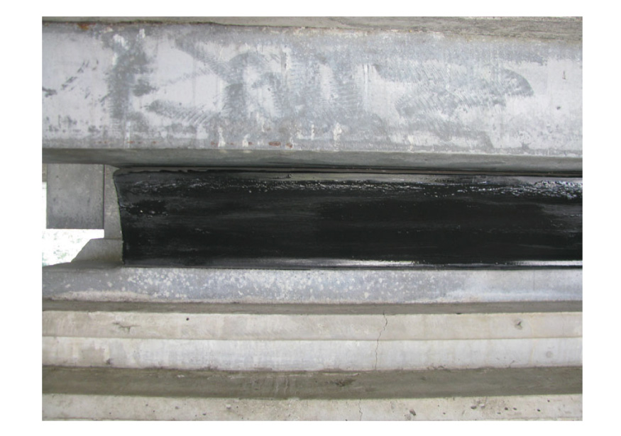 HBコートは上記の課題に対応した補修材で、一液タイプのため現場で混合する必要がなく簡易に塗布できる。また、伸び性能が1,000%以上とゴム支承に用いられるゴム材料の伸び性能450~600%に比べて優れており、ゴム支承のせん断状況により亀裂が生じた状態で塗布した場合でも、温度変化によるゴム支承の動きで亀裂が開いても追随できるので作業時期を選ぶ必要がない。同様に10年の温度変化による繰返し変形にも追随できるため長期の表面保護機能を確保することが可能だ。