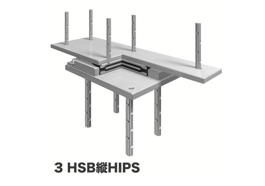Hipsは内部が凹状に加工された上下鋼板と、これに挟まれたゴムとドーナツ状のリングプレートよりゴムの圧縮変形が拘束され、大きな支持力を得られる構造になっている。鉛直支持力は安全率を考慮して25N/㎜2の高支圧応力度で使用できるので、ゴム形状を小さくできるメリットがある。Hipsはスライディングプレートとの組合せでスベリ機能を有しており、ゴムバッファはせん断変形により水平力を伝達する機能である。地震時に上部工が移動した時、スベリ支承に発生する摩擦係数とゴムバッファのせん断バネとの組合せで免震構造として使用される。
