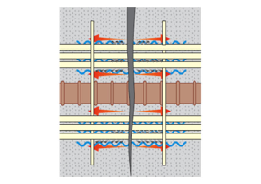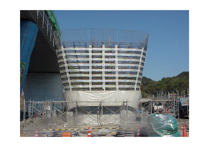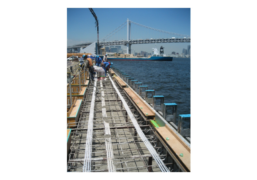 新設マスコンクリート工事などのひび割れが予想される方向や箇所に対して集中的にネットを敷設し、ひび割れ発生に対する局部的耐力を向上させることによりひび割れを発生しにくくする。またネットの持つひび割れ分散効果により、1本当たりのひび割れ幅が極めて狭くなる。このため、耐久性に影響を与えるひび割れへと成長しにくくなる。これらのメカニズムにより、コンクリート構造物に発生する補修を必要とするひび割れの発生を抑制することができる。