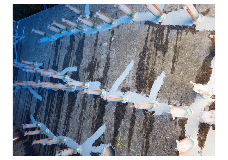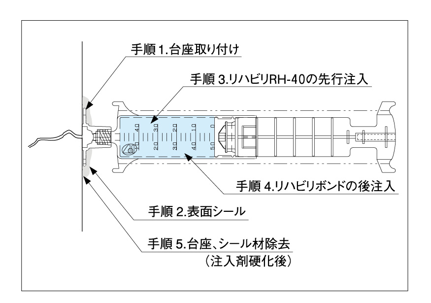 施工手順は①施工箇所の下地処理(研掃) 後、②CRBインジェクターの台座取り付け、クラック部のシール 3.亜硝酸リチウム『PSL-40』をCRBインジェクターにて注入 4.ひび割れ3種エポキシ注入剤『リハビリボンド』をCRBインジェクターにて注入 5.シールの撤去、研掃、清掃。