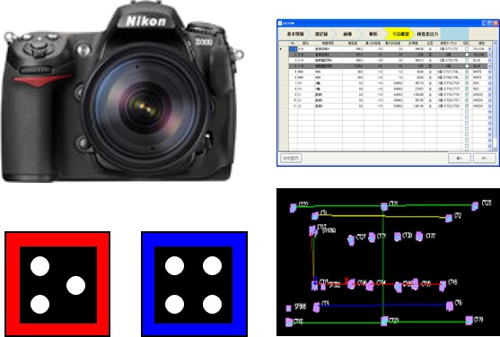 本システムの特徴は、計測対象箇所にターゲット(目印)を設置し、写真を撮れば、その場で直ぐにCAD図面を出力できる業界初の写真計測図化機能である。これにより従来の計測後に発生していた図面作成の手間がなくなり、工場製作データ(NCデータ)の出力まで一気通貫で流れるため、工期の短縮に繋がる。