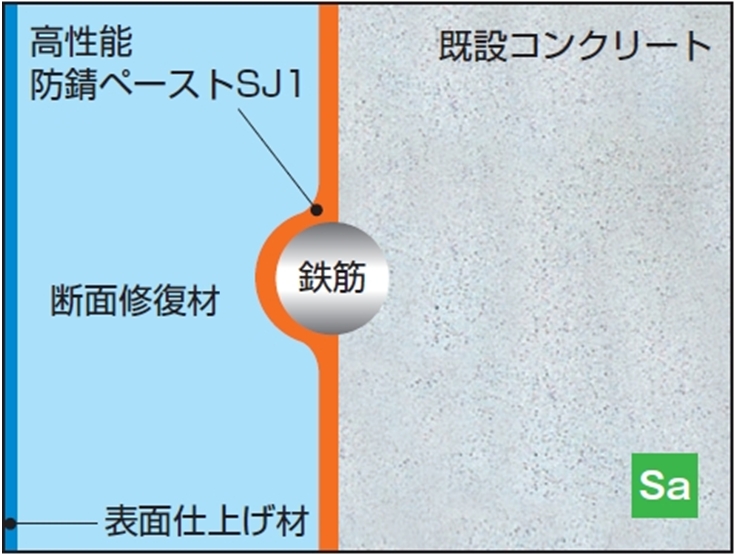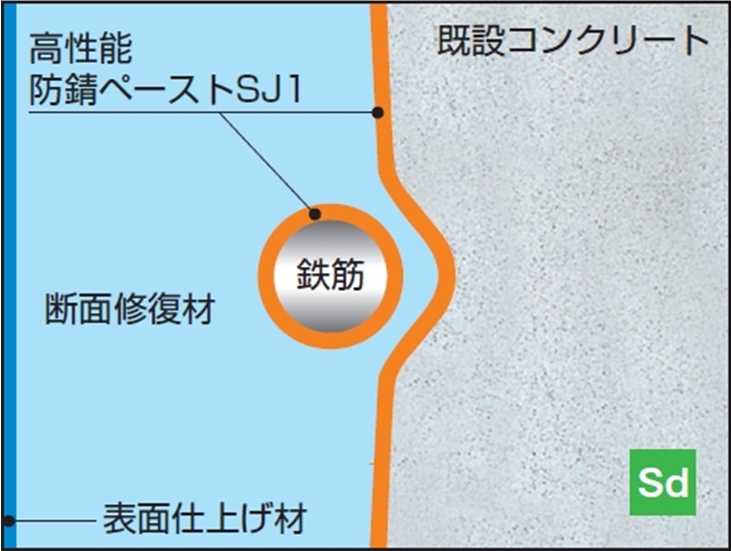 同工法は正に帯電させた層状構造を有する「塩分吸着剤」により塩化物イオン(Cl⁻)を吸着し、予め保持していた亜硝酸イオンを放出することにより、長期的な鉄筋防錆効果を実現するもの。アクリル系粉末ポリマーを使用することで鉄筋や下地に対する付着耐久性にも優れており、硬化したペーストは緻密で、鉄筋を長期にわたって防錆できる。特に塩害によって劣化したコンクリート構造物は損傷部をはつって断面修復しただけでは、残存塩分による再劣化やマクロセル腐食が懸念されるが、「塩分吸着剤」の作用により外部からの塩分だけでなく内在塩分による劣化に対しても効果が高い工法として、実績を大きく伸ばしている。SSI工法で使う防錆ペーストは内在塩分量に応じて塗布厚さを変えることで適切な防錆能を発揮する高性能タイプが開発され、躯体の強度や環境条件・施工条件に応じて断面修復材(4種類ある)を選択することによって、最適な材料の組み合わせが可能となる。