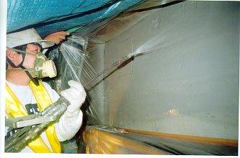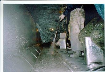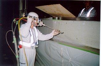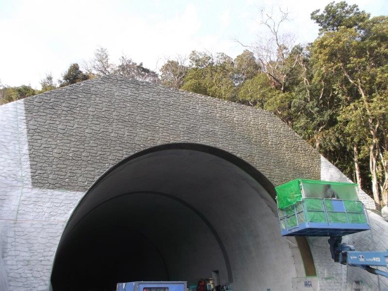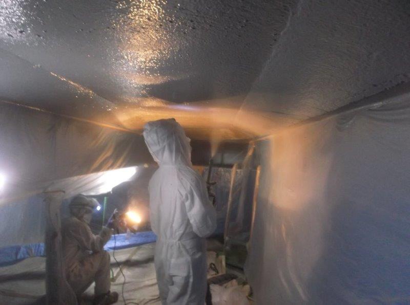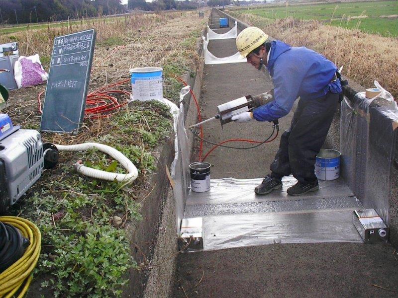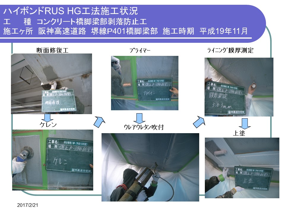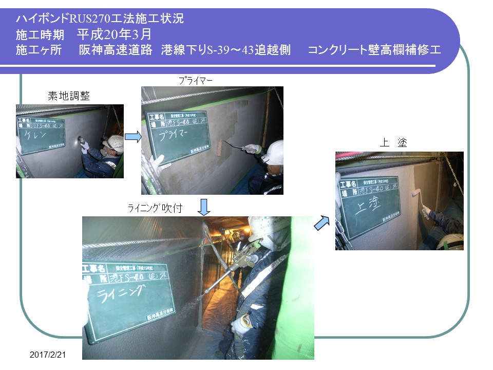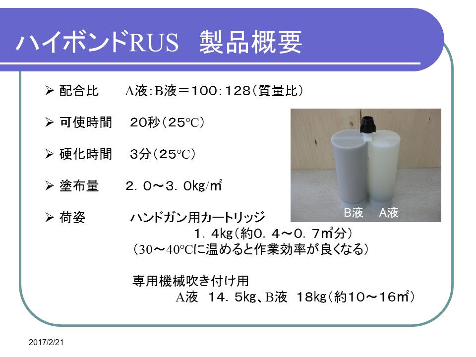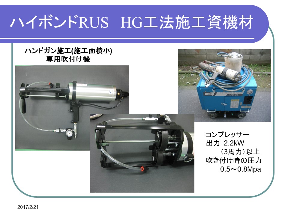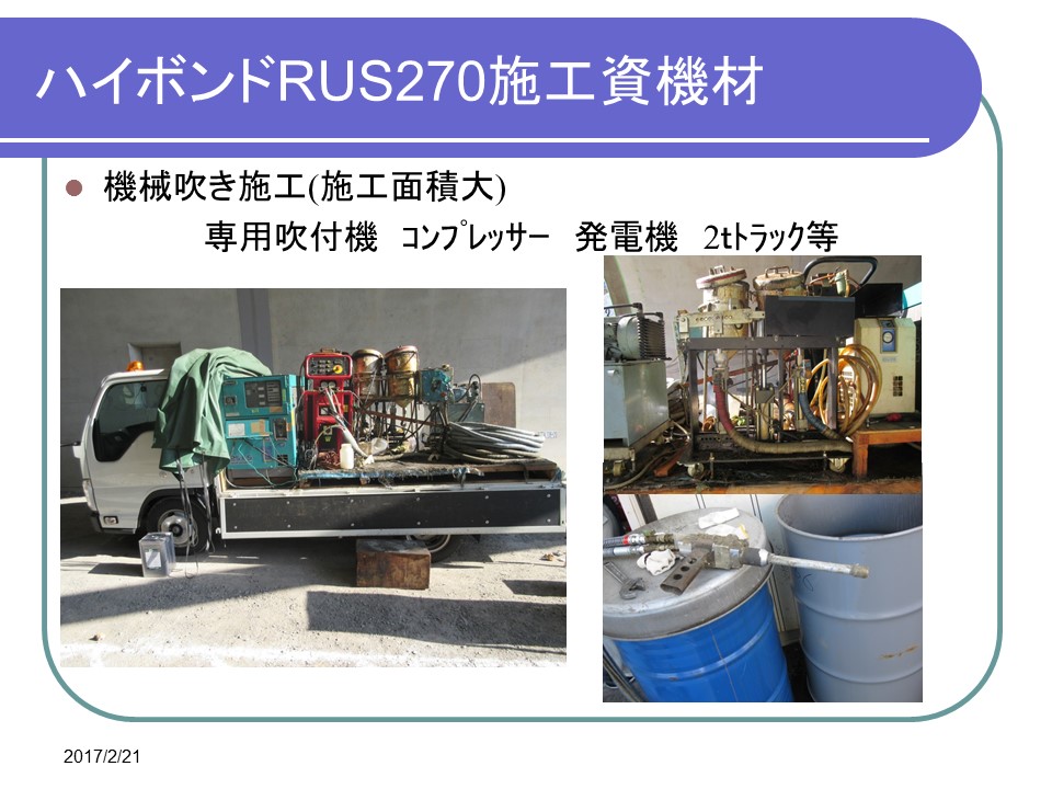 ハイボンドRUS工法には専用の吹き付け機を使用する270工法とハンドガンを使用するHG工法があり、270工法は設備が大きくなるが、大面積を短時間で施工ができる。HG工法は3馬力程度のコンプレッサーとハンドガンだけのコンパクトな設備で、少ない専有面積での小面積の施工に適している。どちらの工法も材料の混合はスタティックミキサー方式を採用しており、吹き付け圧の調整が可能で一般的な吹き付け塗装と比べて飛散が少ない。また、吹き付け工法なので、トンネル坑口など凹凸のある面でも、平滑にするための下地処理を省略でき工程短縮が可能となる。形成する塗膜は耐摩耗性に優れ、土砂を含んだ水が流れる開水路の防水、保護材としても適しており、農業土木事業への展開も期待できる。