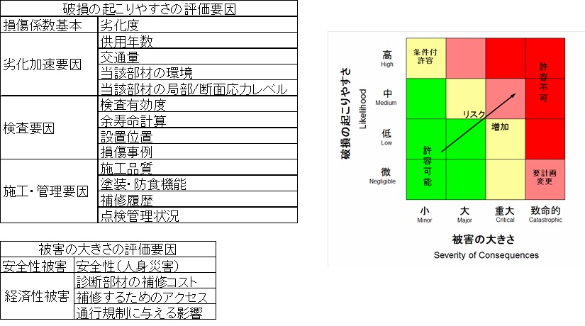 RBMは、リスクを指標として、維持管理の順位付けの選択を行う手法。リスクは損傷係数基本(劣化度)、検査要因、施工・管理要因を定量化したものからなる「破損確率」(破損の生じやすさ)と、安全性(人的災害に関する影響度)、経済性被害(補修に関する影響度)の2項目について定量化したものからなる影響度を掛け合わせて求められるもの。部材の重要度、劣化要因やその進行状況、検査のし易さ、第三者被害の可能性や大きな損傷が生じた場合の経済に与える影響などを加味した上でリスクを評価し、補修補強を行うべき橋梁の順位付けや、個々の橋梁の補修補強すべき部位の優先順位を決定することができる(下表およびグラフ)。