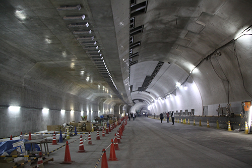東京都と首都高速道路は、2日中央環状品川線の山手トンネル内でトンネル点灯式および現場見学会を開催した。山手トンネルの総延長は18.2㌔あり、国内の高速道路トンネルとしては最長。高松入口~大橋JCT間はすでに開通しており、大橋JCT~大井JCTに接続する約9.4㌔も来年3月までに完成供用させる予定で、首都圏三環状(中央環状線、外環道、圏央道)としては初めて環状道路として完成する。