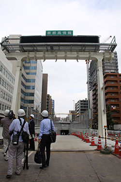 トンネル照明には全線にLED照明を採用しており「従来照明の7~8倍の耐久性を有し、ランニングコストも年間数百万円縮減できる」(首都高速道路・遠山雄一東京建設局長)。また、壁面には全線にわたって視線誘導塗料を施工している。同塗料は安全性を考慮して反射率、清掃を考慮して耐摩耗性という要求性能を課しており、今回の現場ではその要求性能を満足した2種類の塗料(シクソン、アトミクス)を採用している。(井手迫瑞樹)