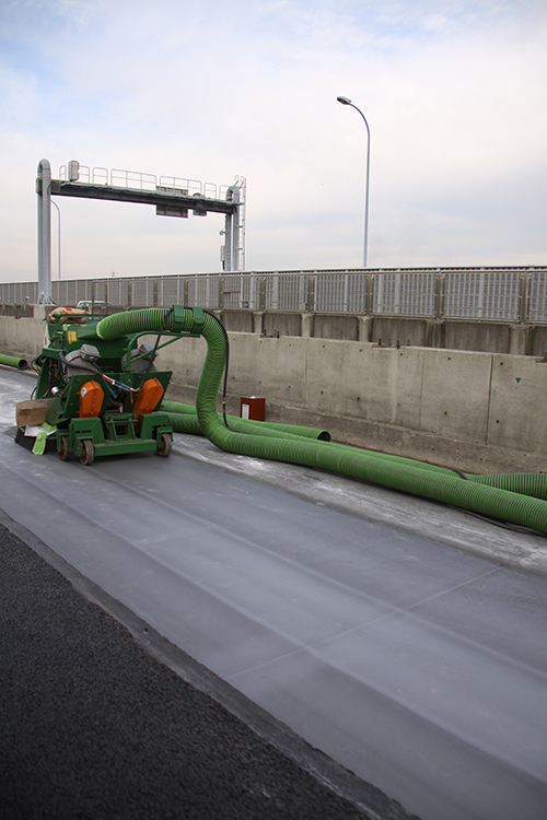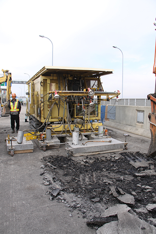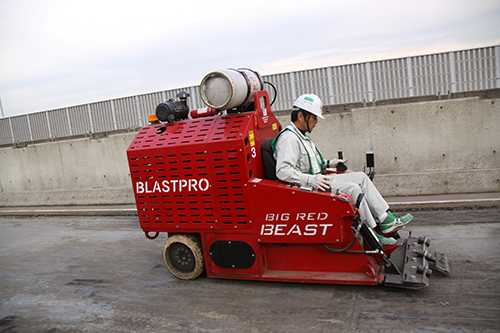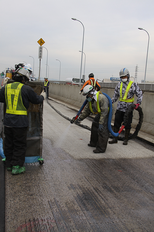 鋼床版の施工については、IH式舗装撤去工法(電磁誘導加熱を利用し、低騒音で鋼床版を傷付けずに舗装を剥離する工法)や乗用タイプの大型剥がし機「ビースト」などを使って床版を傷つけないように注意しながら、舗装を撤去。ショットブラストで表面を研掃し、新しい舗装を施工していた。(詳細は11月16日号の「現場を巡る」で掲載します)